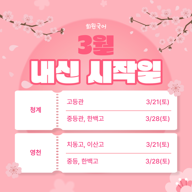 안녕하세요. 희원국어학원입니다. 설레는 마음으로 시작한 새학기도 잠시, 어느새 내신 대비 기간✍이 코앞으로 다가왔습니다. 우리 학생들의 새학기의 도전이 흔들리지 않도록, 희원국어가 든든하게 함께하기 위해 내신대비 개강 일정 및 시간표 안내드립니다. 자세한 내용은 아래 이미지를 통해 확인해주세요 * 문의사항은 카카오채널 또는 학원으로 연락 부탁드립니다. * 2026학년도 희원국어 대입 결과 희원국어가 학생들과 이룬 입결의 신화! 희원국어와 함께 한다면 여러분들도 2027학년도 신화를 이룰 수 있습니다. 2026년 1학기 내신대비 개강 일정 및 시간표 희원국어 청계중등관 희원국어 청계고등관 ❗고3 ....... <img src="https://blogthumb.pstatic.net/MjAyNjAzMTNfMzkg/MDAxNzczNDAxODcxMjkw.GOBBfyBJwve4h9ekXcBexOlVULjc0UwfdMlHaMePz9Eg.rXCYZ1ugdZGpmb__gOharfpYUoj_9L42WV698yAaP2Ig.PNG/%C0%CC%C0%BD%C7%C1%B7%CE%C1%A7%C6%AE_%BC%B3%B8%ED%C8%B8_%B3%BB%BD%C5.png?type=s3" />