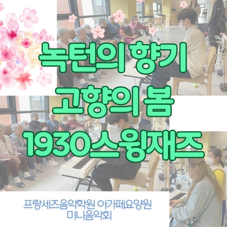 동탄피아노 동탄음악학원 능동피아노 능동음악학원 **요양원에서 열린 작은 음악회, 그리고 음악이 전해준 순간들** 동탄 피아노학원 , 동탄 음악학원, 능동 피아노학원, 능동 음악학원 프랑세즈음악학원에서 지난 2월 24일, 학생들과 함께 요양원을 방문해 작은 음악회를 열었습니다. 이번 음악회는 대강당이 아닌 각 층 로비에서 진행되었습니다. 4층에서 시작해 3층, 그리고 2층으로 이동하며 같은 프로그램을 세 번 연주했습니다. 창가 소파에 앉아 계신 어르신들, 휠체어에 앉아 계신 어르신들 앞에서 포터블 피아노를 놓고 작은 음악회를 시작했습니다. 동탄 음악학원, 동탄 피아노학원, 능동 음악학원, 능동 피아노학원 이번 연주에는 중....... <img src="https://blogthumb.pstatic.net/MjAyNjAzMDZfMTAx/MDAxNzcyNzUyNTAyNjY0.1JRQRngtNmimsgSdhmhoKWb-EozbkFqw9tuXPcj5_Qkg.Udjk33qrjm-XBc4keglYWC3-qVTp44lNnsIYvst1aAQg.JPEG/%B3%EC%C5%CF%C0%C7_%C7%E2%B1%E2_%B0%ED%C7%E2%C0%C7_%BA%BD_%BD%BA%C0%AE%C0%E7%C1%EE_%281%29.jpg?type=s3" />