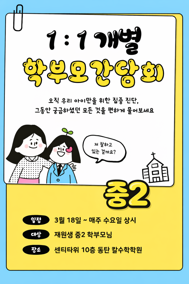 칼수학 중2 대상 1:1 개별 학부모 간담회 대상: 중학교 2학년 중2 대상 1:1 학부모 간담회 안녕하세요 동탄 반송동 칼수학학원입니다. 칼수학학원 중2 학부모님의 궁금증을 시원하게 해결해 드리고자 1:1 개별 간담회를 마련했습니다. 중학교 1학년이라는 자유학기(년)을 지나, 본격적인 입시 수학 관문에 들어서게 된 우리 중2 학생들을 위해 맞춤형 학습 피드백을 드리는 자리이니 편안하게 방문하셔서 소중한 소통의 시간 가지시길 바랍니다☺ 매주 수요일, 우리 아이의 현재를 상태를 점검하고 미래를 설계하는 중등2학년 학부모님 대상 1:1 간담회를 진행합니다. 이번 간담회는 전체 공지가 아닌, 변화가 가장 절실한 중2 학부모님들만을 모....... <img src="https://blogthumb.pstatic.net/MjAyNjAzMTJfMjg1/MDAxNzczMzE0NTQxOTYy.cuxiAu-dhy5tCs0rs2XyztHloaizzlApKHMWcOzMgsQg.7lddjG1Z-HlVpmJueY-xo8zCBwJnci5B1LbuXjUIbT4g.PNG/ChatGPT_Image_2026%B3%E2_3%BF%F9_12%C0%CF_%BF%C0%C8%C4_08_22_15.png?type=s3" />