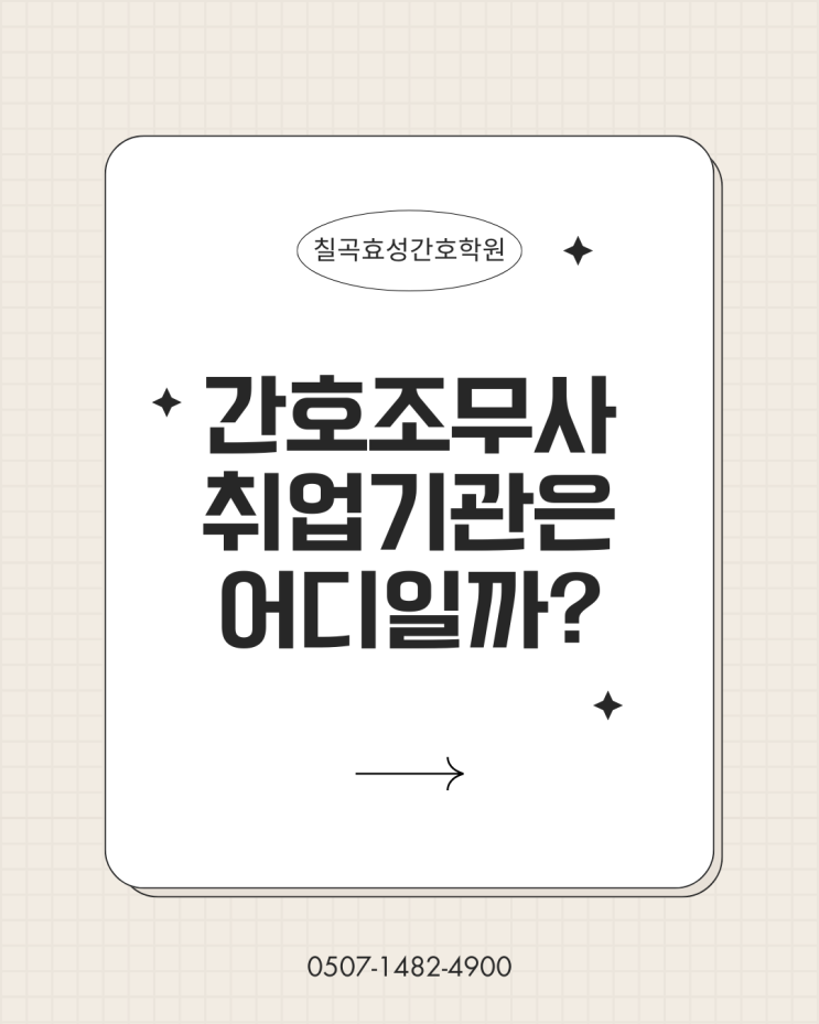 안녕하세요. 칠곡효성간호학원입니다. 간호조무사 자격증 취득을 고민하시는 분들이 가장 많이 하시는 질문 중 하나가 바로 "자격증을 따면 정말 병원에서만 일하나요?"입니다. 결론부터 말씀드리면, 간호조무사의 활동 영역은 우리가 생각하는 것보다 훨씬 더 넓고 다양합니다. 오늘은 칠곡효성간호학원 원장님의 설명을 바탕으로, 여러분의 소중한 자격증이 빛을 발할 수 있는 다양한 취업 기관들을 상세히 소개해 드립니다. 1. 가장 기본이 되는 보건의료의 중심, 의료기관 간호조무사가 가장 많이 활동하는 곳은 단연 의료기관입니다. 우리 주변에서 쉽게 볼 수 있는 동네 의원부터 전문 병원, 종합병원, 그리고 대학병원인 상급종....... <img src="https://blogthumb.pstatic.net/MjAyNjAzMTBfMTI5/MDAxNzczMTI2MTM3NjU4.HUNB3wAQdtcIbZM7cpPDlRXk6ZMdDBLKpxmkMdHcoOwg.EhqOFy-ecey7qJ1T9gdZe43fFpgt1MBYsnMr2b2fXDAg.PNG/%C4%A5%B0%EE%C8%BF%BC%BA%B0%A3%C8%A3%C7%D0%BF%F8_%B0%A3%C8%A3%C1%B6%B9%AB%BB%E7_%C3%EB%BE%F7_%B1%E2%B0%FC.png?type=s3" />
