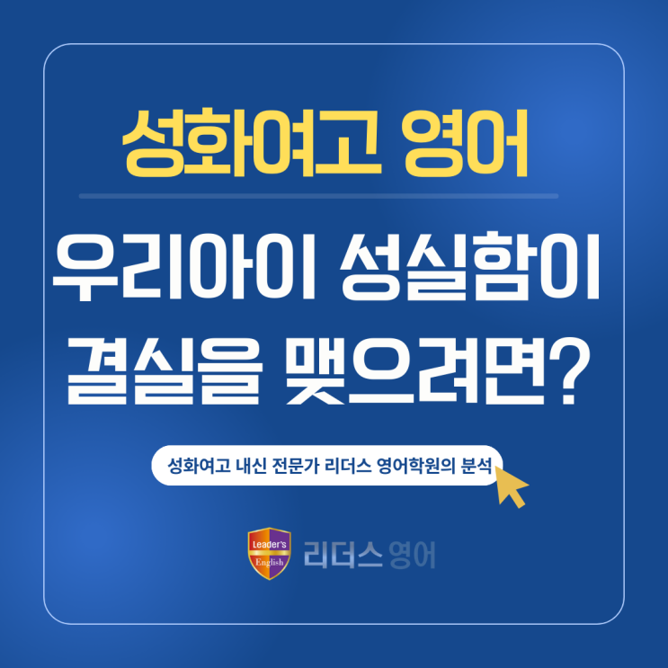 성화여고 1학년 영애 내신, ‘성실한 아이들’ 사이에서 나의 노력이 1등급이 되려면? 안녕하세요, 복현동 리더스 영어학원 입니다. 성화여고 교복을 입고 설레는 마음으로 입학한 신입생 여러분, 진심으로 환영합니다! 아마 여러분 중에는 중학교 때 영어만큼은 자신 있었고, 누구보다 성실하게 단어를 외우고 본문을 암기했던 친구들이 많을 거예요. 하지만 성화여고 선배들이 입을 모아 하는 말이 있습니다. "중학교 때처럼 성실하게만 해서는 성화여고 영어 내신을 감당할 수 없다." 왜 그럴까요? 여러분의 귀한 노력이 억울한 성적표로 돌아오지 않도록, 성화여고에서 진짜 '결실'을 맺는 전략적 성실함에 대해 이야기....... <img src="https://blogthumb.pstatic.net/MjAyNjAzMThfMTA5/MDAxNzczODM2MjU3NDUy.VLc4QF7Pd9KjwGTkCuo_RR1SlEA3Wtfzt-wNNb6_vI8g.3_S9Wkq0GAKSdjg8km_Pcsg58sOS1wA_coxzgIBpqngg.PNG/1.png?type=s3" />