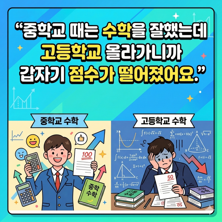 고1 수학이 갑자기 어려워지는 이유 “중학교 때는 수학을 잘했는데 고등학교 올라가니까 갑자기 점수가 떨어졌어요.” 중학교 때까지 수학을 잘하던 학생이 고등학교에 올라가면서 갑자기 어려움을 느끼는 경우가 많습니다. 실제 상담을 하다 보면 학부모님들께서 이런 말씀을 자주 하십니다. “중학교 때는 수학을 잘했는데 고등학교 올라가니까 갑자기 점수가 떨어졌어요.” 이런 현상은 특별한 경우가 아니라 많은 학생들이 겪는 변화입니다. 고등학교 수학은 중학교 수학과 학습 방식 자체가 달라지기 때문에 처음에는 당황하는 학생들이 많습니다. 고1 수학이 어려워지는 이유는 크게 세 가지로 볼 수 있습니다. 먼저 개념의 양이 크게 늘....... <img src="https://blogthumb.pstatic.net/MjAyNjAzMTBfNTIg/MDAxNzczMTA3NzY1Nzk3.3Qu1C7gYc9ExyyPLaCuyfv4a7-DpWJhQHPAK6WYJZsIg.niBLHwyTE2RBliUxyxB7GYmpSCgbqRZwbAoVbUUmFckg.PNG/%B0%ED1%BC%F6%C7%D0%C0%CC_%BE%EE%B7%C1%BF%F6%C1%F6%B4%C2_%C0%CC%C0%AF_%BD%E6%B3%D7%C0%CF.png?type=s3" />