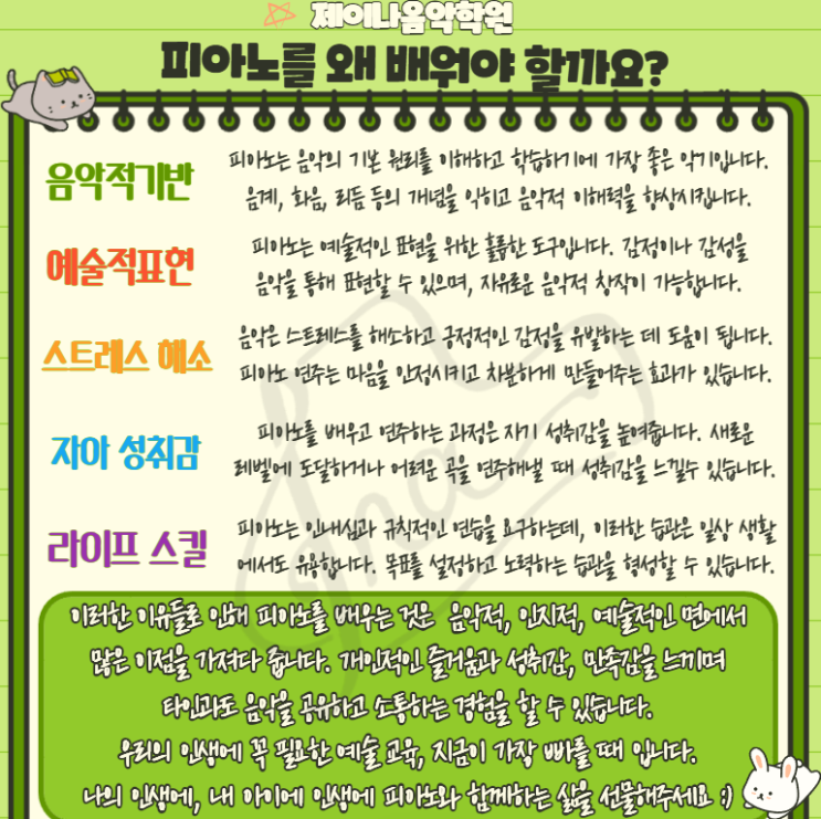 등록번호 제3793호 교육비 14만원~ 기초단계에서 레슨시간을 충분히 확보해야 하는 이유는? 손모양은 '설명'이 아니라 '교정'이기 때문입니다. 1. 손모양은 처음 굳어지면 다시 되돌리기 어렵습니다. 피아노 손모양은 지식이 아니라 습관이에요. • 손가락을 편 채로 치는지 • 손목이 꺾이는지 • 힘이 손끝이 아닌 팔 전체에 실리는지 이런 것들은 처음 배울 때 몸이 기억해버립니다. 짧은 레슨, 다수가 수용되는 수업에서는 “동그랗게~”라고 말은 해주지만 실제 손이 왜 그렇게 안 되는지까지는 보기 어렵죠. 2. 아이가 연주하는 '손'을 ‘지켜보는 시간’이 필요해요. 기초 아이들 손은 금방 힘이....... <img src="https://blogthumb.pstatic.net/MjAyNjAzMDNfMjM3/MDAxNzcyNTE0MDgwMjg0.cek4PBMz5RAvhGk3gbHp5_KPE8djaS3Ym9gSfbTzBrsg.-MGz2-6otq41dMNCMShDgW6DB1lB8odRWY59ECUPg3Eg.PNG/%C1%A6%C0%CC%B3%AA-%C7%C7%BE%C6%B3%EB%B9%E8%BF%EC%B4%C2%C0%CC%C0%AF.png?type=s3" />