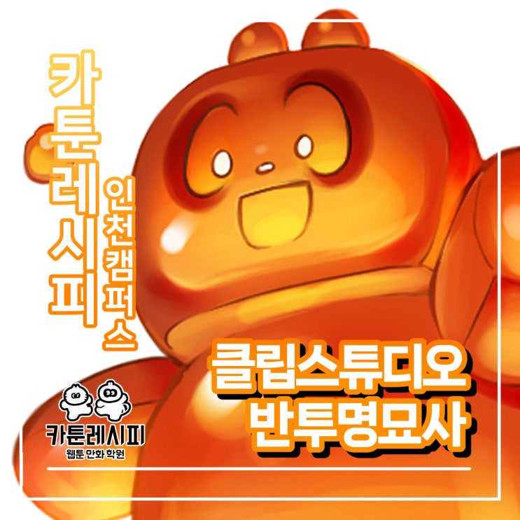 안녕하세요~☺️ 인천만화학원 인천웹툰학원 카툰레시피 인천캠퍼스 입니다! 이번에 준비한 내용은 <클립 스튜디오로 반투명 개체 질감 묘사해보기> 입니다~!! 첫 과정부터 하나하나 보러 가볼까요? 스케치 여러분들은 반투명 개체하면 무엇이 먼저 떠오르시나요? 유리, 비닐, 왁스, 플라스틱 등등등~ 다양하지만 저같은 경우에는 젤리가 먼저 떠올랐는데요. 카툰레시피 학원 마스코트를 젤리화 시켜 드로잉해보았습니다. (젤리몬스터.. 귀엽죠?) 밑색 바로 밑색을 작업해줍니다. 묘사 단계에서 채도를 계속 높여줄거라 살짝 칙칙한 주황컬러로 밑색을 깔았습니다! 개인적으로 마무리 작업에서 선을 다듬는 편이라 펜선 작업은 생....... <img src="https://blogthumb.pstatic.net/MjAyNjAzMDNfNCAg/MDAxNzcyNTI1MDg4NzYw.uR7lPRG7Sw6vMWQq6PyOrPUWg8v2Ci2NNQwKM9F3gVMg.Jd3NENJTxg2-afXowvncCSbV83u2yftaUhG3_ruSXhkg.JPEG/%BA%ED%B7%CE%B1%D720260303jpg.jpg?type=s3" />