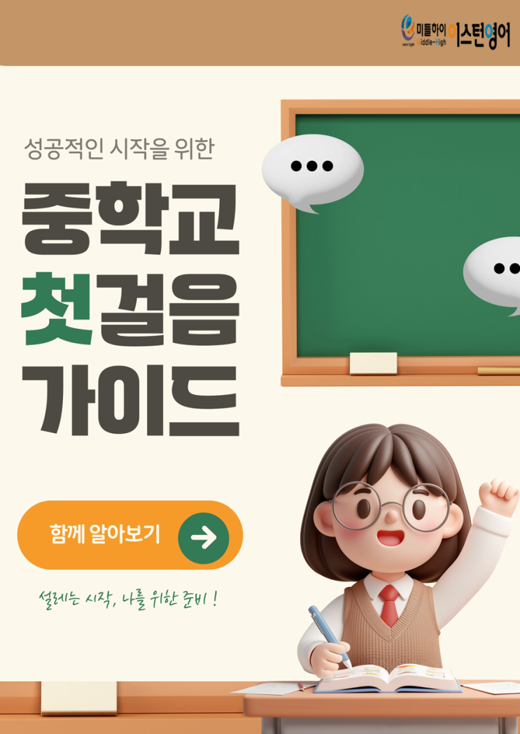 안녕하세요 인천 만수6동 만수3지구영어의 대표영어학원 단어와 문법이 강한 남동중영어 전문 학원 20년 전통의 미들하이 이스턴영어학원입니다. 중학교1학년 첫걸음 가이드 by 미들하이 이스턴영어 오늘은 26년 중학교 1학년이 되는 친구들을 위해 학교생활에 대한 정보를 알려주는 카드뉴스를 만들었습니다. 참고하셔서 새학기 새학년을 잘 시작해 보기를 바랍니다. 중학교는 고등학교 진학전 공부와 태도의 습관이 완성되는 시기입니다. 이 시기에 다양한 독서 계획적인 생활 집중력 높이기 등을 실천해 보고 공부 근력을 키워 보길 바랍니다. 중1 학생들의 중학교 출발을 응원합니다. 영작으로 구문력! 다량반복 어휘력! 해브듣기로 청취력 !....... <img src="https://blogthumb.pstatic.net/MjAyNjAzMDhfMjM2/MDAxNzcyOTc5NjYyODQ0.pqdCpV2Jq2ueLIkOaVywglu-U-h8Sc8cmZn1RtnO2qgg.UqXBfbovlu0y_uSjFMnakjPSEkhntTTp0nGUfZ7HIJUg.PNG/%BD%BD%B6%F3%C0%CC%B5%E51.PNG?type=s3" />