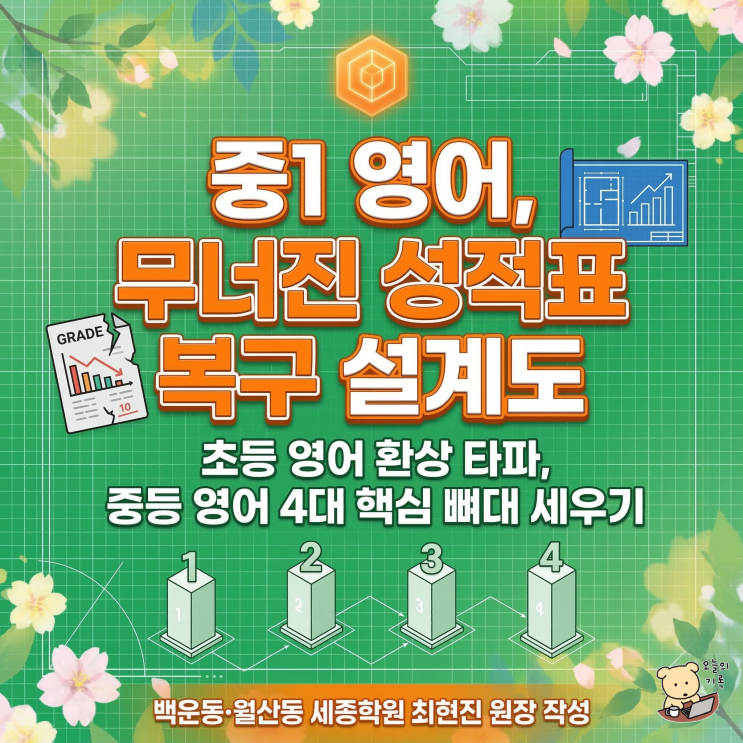 안녕하세요? 저는 백운동·월산동에서 영어학원 세종학원을 운영하고 있는 최현진입니다. 백운동·월산동에서 중학교 1학년 자녀를 키우는 학부모님들과 상담을 하다 보면 매년 봄, 비슷한 이야기를 듣게 됩니다. "초등학교 때는 영어가 괜찮았는데, 중학교 올라가더니 갑자기 어려워해요." "단어는 외우는 것 같은데 문장을 만들지는 못해요." "시험지를 보면 본 적은 있는 것 같은데 자꾸 틀려요." 처음 이런 말들을 들었을 때 학부모님 마음은 어떠셨나요? 당황스럽고, 어디서부터 도와줘야 할지 막막하셨을 것 같습니다. 매년 중학교 1학년 학생들을 만나면서 느끼는 것이 있습니다. 아이가 영어를 어려워하기 시....... <img src="https://blogthumb.pstatic.net/MjAyNjAzMTZfMTA3/MDAxNzczNjIzOTk4MzYx.0AyON8zHCqadTMVRydJmFUQeNQhwnRhOxQhWlpGsCAwg.pT5a2f9cJ2ozl-El2YFIaWA_KjyZlTNGm-Stm6AwwEQg.PNG/Gemini_Generated_Image_holahlholahlhola.png?type=s3" />