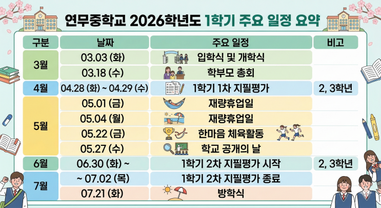 안녕하세요 연무중학교와 다산중학교 1학기 주요 학사일정을 올려드립니다. (각 학교 홈페이지에 있는 내용을 참고하였습니다) 미리미리 체크하시고 중요한 일정 놓치지 마세요~ <img src="https://blogthumb.pstatic.net/MjAyNjAzMDdfMjUz/MDAxNzcyODg3Mjc1Mjc5.Q_5PzsARGM0vcOk6OFick93WzQ3HP7Bk8mLfcGwGQxAg.utEWxL1fHoLkVe0kS4P_8F2lh9zqQf_8mUFCLClAiuog.PNG/%BF%AC%B9%AB%C1%DF%C7%D0%B1%B3.png?type=s3" />