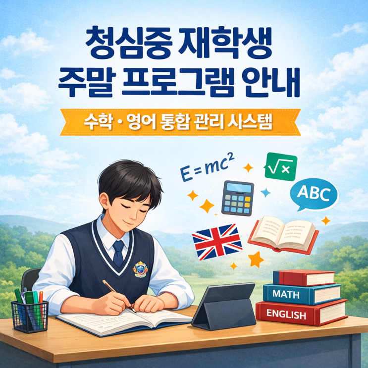 #청심국제중 재학생을 위한 주말 학습 프로그램 안내 수학 · 영어 통합 관리 시스템 청심 재학생들은 기숙사 생활과 학교 수업으로 인해 평일에 학습 시간을 충분히 확보하기 어려운 경우가 많습니다. 그래서 많은 학부모님들이 고민하시는 부분이 바로 ❓ “주말을 어떻게 활용할 것인가?” 주말 시간을 어떻게 보내느냐에 따라 학생들의 학습 격차가 크게 벌어질 수 있습니다. 이러한 고민을 해결하기 위해 청심 재학생을 위한 주말 수학 · 영어 통합 학습 프로그램을 운영하고 있습니다. 단순히 문제 풀이 중심의 수업이 아니라 자기주도학습 + 개념 강의 + 주말 몰입 관리가 결합된 시스템입니다. 수학 · 영어 통합 관리 시스....... <img src="https://blogthumb.pstatic.net/MjAyNjAzMTVfMjgg/MDAxNzczNTU4NDA4MzQ0.Ysd0NuzAcW8gaReeiagFQT-G84pkZpwNGFbaGz1skeMg.YmWDhJK0yddvn5fItyCoWhNiFeGeaPH-NImhtvE-KH0g.PNG/ChatGPT_Image_2026%B3%E2_3%BF%F9_15%C0%CF_%BF%C0%C8%C4_04_06_27.png?type=s3" />