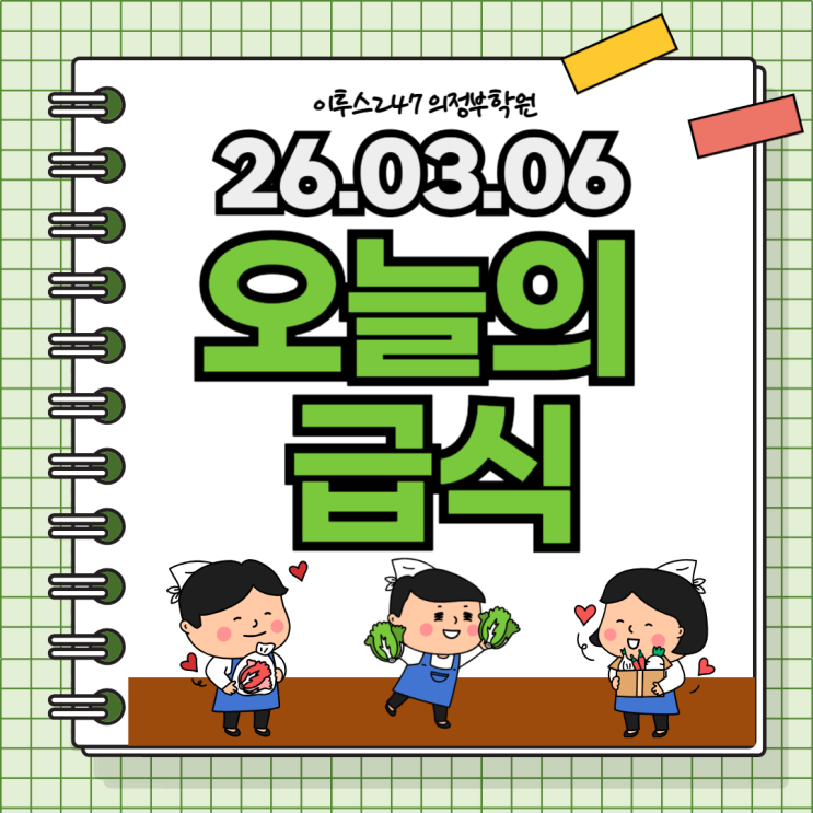 안녕하세요 :) 이투스247 의정부학원입니다! 2026. 03. 06 오늘의 점심 맑은미역국, 오징어두루치기, 미니오꼬노미야끼, 펜네라구파스타볶음, 보리새우무나물, 돈나물초무침, 김치류 2026. 03. 06 오늘의 저녁 근대재래된장국, 소보로덮밥, 치킨가아아게, 어묵비빔당면, 마시는 요거트, 김치류 오늘도 잘 먹었습니다 :) #이투스 #의정부이투스 #이투스247 #의정부독학재수 #의정부독재 #독학재수학원 #의정부수능 #의정부입시 #재수 #반수 #입시 #수능 #정시 #수시 #한수 #이감 #시대인재 #재수정규반 <img src="https://blogthumb.pstatic.net/MjAyNjAzMDdfMjUx/MDAxNzcyODY0OTE4NzQ2.ycK2WaZ89Gt7yJ-dGMUumXA9UbI3FVFOY9au3gXVFyEg.dQrDKtlaEKKAuoCw27g78KoaC-L9-bb-yImbo_BW4uMg.PNG/002.png?type=s3" />