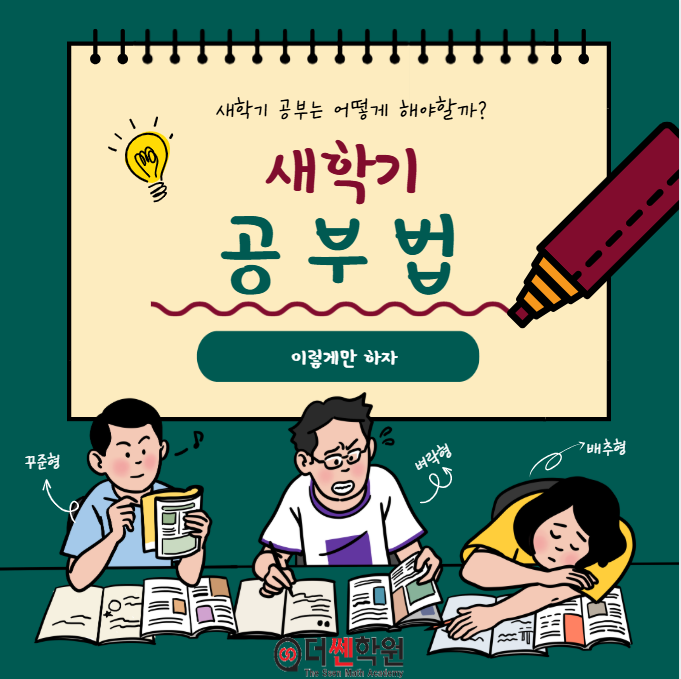 안녕하세요 풍무동 수학학원 더쎈입니다. 어느덧 26년 1학기가 개학하고도 일주일이 흘렀습니다. 다들 열심히 적응하는 시기일 텐데요 새 학기 공부법에 대해 간략하게 소개해 드리겠습니다. 3월을 잘 보내야 된다. 첫 번째로 개학하고 첫 달인 3월을 잘 보내야 합니다. 보통 학생들이 이 기간에 새로운 환경에 적응한다고 학업에 조금 소홀히 하는 경향이 있습니다. 하지만 이 기간에 주요 과목들은 어느 정도까지 실력을 끌어올릴 필요가 있습니다. 4월부터는 각종 수행평가 + 행사들 때문에 지금보다 공부할 시간이 없어집니다. 시간 많다고 생각하지 말고 지금 바로 준비해야 됩니다. 너무 큰 욕심을 내지 말자. 새 학기가 시작되면 보통 모....... <img src="https://blogthumb.pstatic.net/MjAyNjAzMDlfMjk3/MDAxNzczMDM3MTM3NDMy.K-teA5ROcEdfLqtRQmDHOihKgTVnr74yTfbL-TGooiwg.n6uAYb1hnuxnIwBEgBfQPt6CvxKqkm4Y8_P9coqC4FMg.PNG/%C4%B8%C3%B3.PNG?type=s3" />