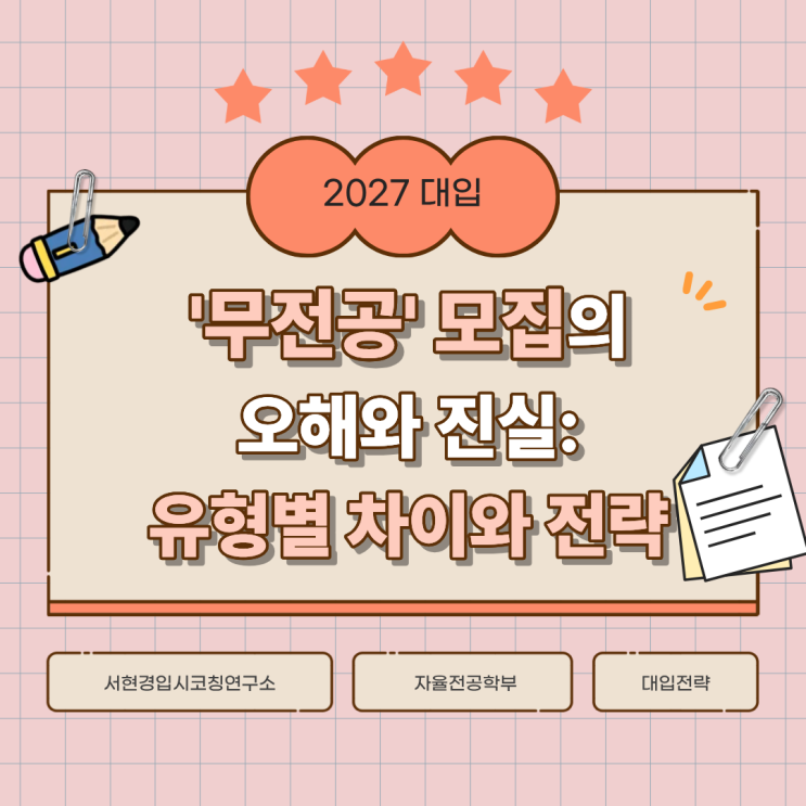 2025학년도부터 급격히 확대된 '무전공(전공자율선택제)' 모집이 2027학년도에도 입시의 핵심 변수로 작용할 전망입니다. 흔히 자유전공학과, 자율전공학과로 모집되는 이 무전공 체제는 모집 규모가 큰 만큼 합격선 예측이 어렵고, 대학마다 전공 선택권이 다르기 때문에 정확한 이해가 필수입니다. 1. 무전공이라고 다 같은 무전공이 아니다? (유형 1 vs 유형 2) 많은 수험생이 "무전공으로 들어가면 대학 내 모든 학과를 다 갈 수 있다"고 오해합니다. 하지만 실제로는 유형에 따라 선택 범위가 극명하게 갈립니다. 2. 전형별 평가 방식: 무엇을 준비해야 할까? 대학별로 무전공 선발 방식이 다르므로 본인의 강점에 맞는....... <img src="https://blogthumb.pstatic.net/MjAyNjAzMTZfNzIg/MDAxNzczNjQyMTg1NDAw.mA1m0dfbmnJjChP6aP1bmlOoQGLdyfFiZ9cos61jiO4g.IAbcBA3mfptZtLINvFsbntD-NKiF10PRKIUawamcI6Mg.PNG/%C1%A6%B8%F1%C0%BB_%C0%D4%B7%C2%C7%D8%C1%D6%BC%BC%BF%E4._%281%29.png?type=s3" />