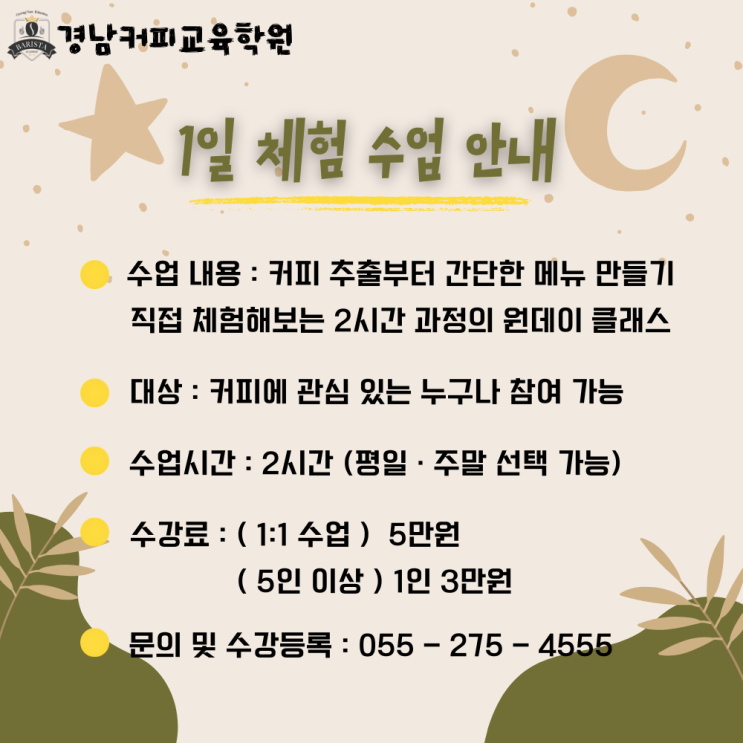 마산 경남커피교육학원 원데이 클래스 수업 안내