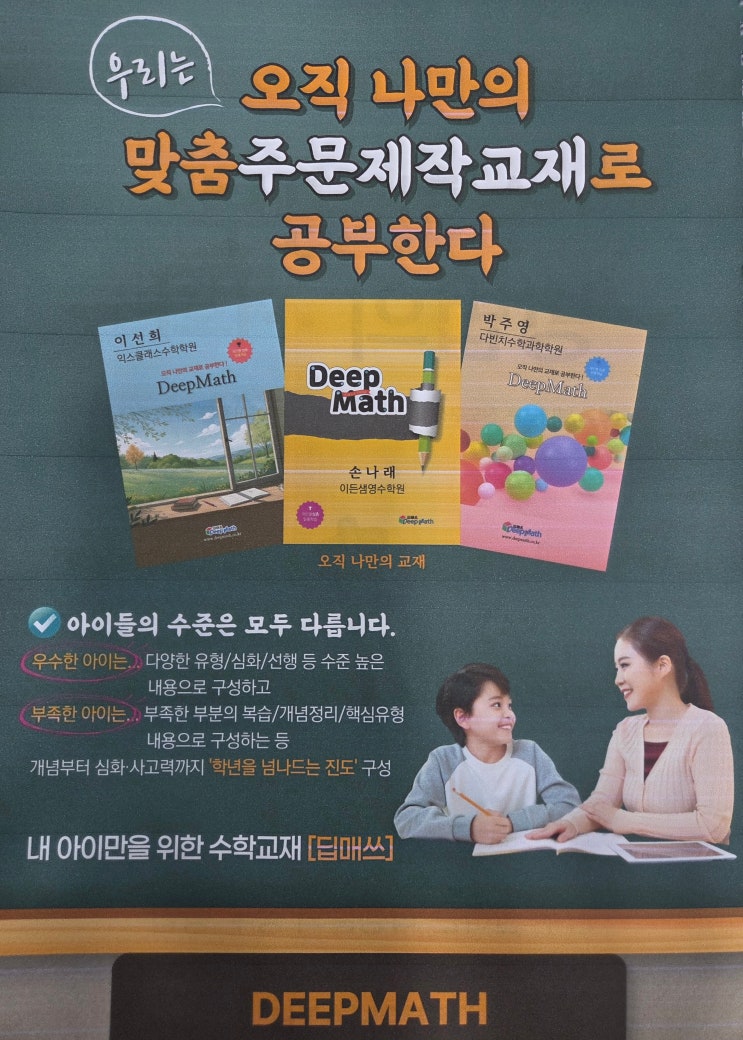 오직 나만의 맞춤 주문 제작 교재로 공부한다!!! 저희 학원에서 도입한 새로운 수학시스템을 소개합니다. 아이들의 수준은 모두 다릅니다. 우수한 아이는 다양한 유형, 심화, 선행 등 수준 높은 내용으로 구성하고, 부족한 아이는 부족한 부분의 복습, 개념정리, 핵심유형 내용으로 구성합니다. 개념부터 심화 사고력까지 '학년의 넘나드는 진도'구성으로 수업하는 딥매쓰수학 도입하였습니다. 매월 학생 개인 교재 맞춤 주문 제작 시스템으로 나만의 교재로 학습합니다. 서술형 평가 시대에 생각노트를 활용합니다. 교재의 한면만 인쇄되어있어서 생각노트에는 문제풀이 깨끗이 정리하면서 풀기, 개념 스스로 정리해 보지, 오답노트로....... <img src="https://blogthumb.pstatic.net/MjAyNjAzMDlfMjAz/MDAxNzczMDM3NjE3MDYz.GtVSP3TPeUY8ZKFBwFmhKkDvawdll6c8BSAeEg7LdxEg.SiiURODr7EVkmUlHGnlQmyDmvrfXH1BB-L_jU__Z-pQg.JPEG/KakaoTalk_20260309_151112248_02.jpg?type=s3" />