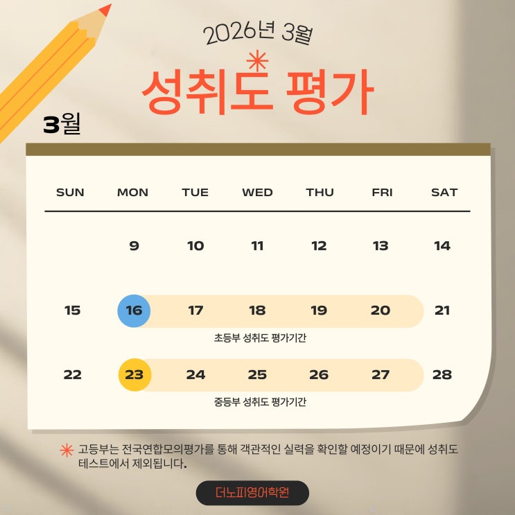 안녕하세요 더노피 영어학원입니다 점점 날씨가 풀리며 봄이 다가오고 있는데요! 새학기와 함께 찾아온 더노피 영어학원 성취도 평가 일정에 대해 안내드립니다. 성취도 평가는 그동안 학생들이 열심히 공부한 지식을 확인하는 시간입니다. 더노피 영어학원에서는 성취도 평가를 3~4개월마다 진행합니다. 이를 통해 학생들의 영어 실력에 대한 객관적인 데이터를 확인하고, 학부모님과 상담하는 시간을 가집니다. 초등부 성취도: 2026년 3월 16일~20일 중등부 성취도: 2026년 3월 23일~27일 성취도 제외대상: 12월 29일 이후 학원 등록한 학생들 고등부-> 모의고사로 평가 위처럼 초등부와 중등부는 다른 기간으로 성취도 평가가 진행되구요! ....... <img src="https://blogthumb.pstatic.net/MjAyNjAzMDVfMTE0/MDAxNzcyNjg3MTYyNTgw.cIkSJn5scQjv2tV2AKBLxP8CiEk1GaoPXkkbIc7BPSwg.LcW-o4givzLqNwM80mRtg6YH_6u0gahh4C8WA3_raLQg.JPEG/%C5%AC%B8%AE%B4%D0.jpg?type=s3" />