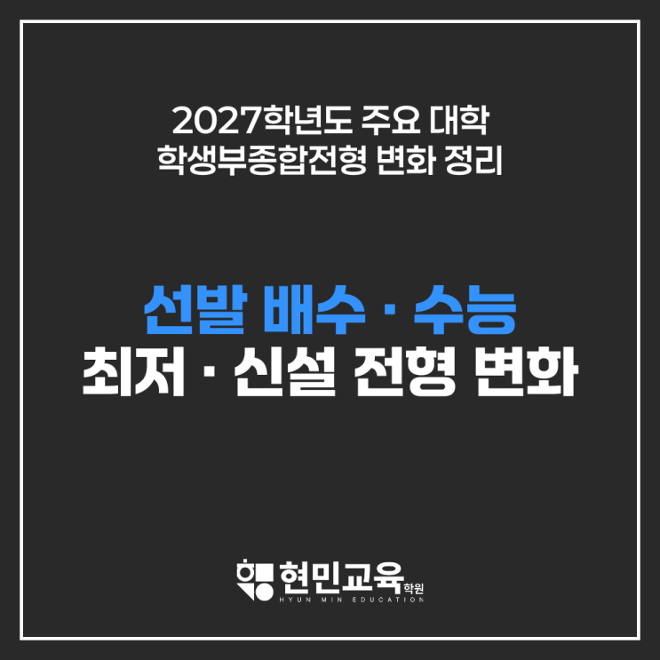 교육에 진심을 담다. 동탄에 위치한 현민교육학원 수학관입니다. 2027학년도 대학입학전형 시행계획이 공개되면서 주요 대학들의 학생부종합전형 변화도 점차 구체적으로 드러나고 있습니다. 특히 일부 대학은 선발 방식과 평가 요소를 조정하거나 새로운 전형을 도입하면서 전형 구조에 변화를 주고 있습니다. 이번 변화는 단순히 모집 인원이 달라지는 수준이 아니라 1단계 선발 방식, 면접 반영 비율, 수능최저학력기준 적용 여부 등 다양한 요소에 영향을 미치고 있습니다. 따라서 지원을 준비하는 학생들은 각 대학별 전형 구조 변화를 정확히 확인하는 것이 필요합니다. 1. 1단계 선발 배수 축소 대학 일부 대학에서는 학생부종합전형 1단....... <img src="https://blogthumb.pstatic.net/MjAyNjAzMTFfNDAg/MDAxNzczMjE0MDk2NzY3.r1n1JBe6hrIje8w2QZn5JnKjDFcByBiJTeW0j76y_nUg.3M4z7p8Uj8KHa43kQ6vnHcNiSSPERNE4tA_HWlB05w4g.PNG/%BD%E6%B3%D7%C0%CF.png?type=s3" />
