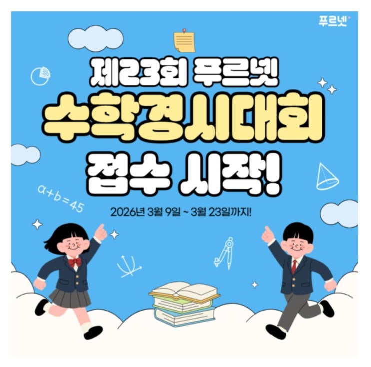제 23회 푸르넷 수학경시대회 접수시작 안녕하세요. 푸르넷하이수학입니다! 제 23회 푸르넷수학경시대회 접수가 시작되었습니다! 푸르넷 수학경시대회는 전국단위 대회로 전국에서 자신의 수학 능력 수준을 확인할 수 있는 아주 좋은 기회입니다. 단순한 시험이 아니라 ✔️ 학습 성취도 확인 ✔️ 전국 단위 실력 비교 ✔️ 자기주도 학습 동기 부여 까지 가능한 의미 있는 대회예요. 왜 참여해야 할까요? 1️⃣ 실력 점검의 기회 현재 우리 아이의 수학 수준이 어느 정도인지 객관적으로 확인할 수 있어요. 2️⃣ 학습 동기 부여 시험을 준비하는 과정에서 목표가 생기고, 성취감을 경험하면서 자신감도 함께 자라납니다. 3️⃣ 수학 자신....... <img src="https://blogthumb.pstatic.net/MjAyNjAzMTBfMTc2/MDAxNzczMTE4NDUyMzM3.2grUT51myp2xf_x1QFlqnL7-AHYCqQYfXB2qTeoheQ4g.9ZNNYoU5zp1aVuXZibvE7MnLOgsacCbNTiPC3reBUf4g.JPEG/900%A3%DF1773117334899.jpg?type=s3" />