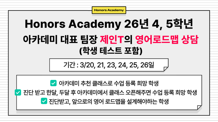 아너스 아카데미 초등 4, 5, 6학년 학생들 주목해주세요! 아카데미 대표팀장 제인T 클래스 및 준T의 문법특강 등 안내