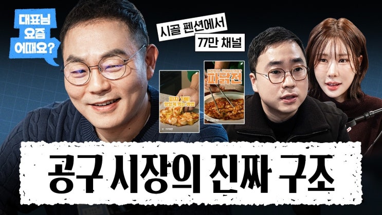 사장님들의 현실 토크쇼 대표님, 요즘 어때요? 사업하는 사람들의 진짜 고민, 매출 · 인력 · 의뢰 · 커리어 사이에서 매일 흔들리는 이야기들. 강남구 대표 X 쥬니가 묻습니다. 현대백화점 MD로 커리어를 시작해 파일럿을 준비하다가, 시골에서 펜션을 운영하며 긴 시간을 보낸 사람. 우연한 계기로 시작한 유튜브와 인스타그램, 그리고 지금은 생활 리빙 공동구매 시장에서 남성 탑 셀러로 자리 잡은 크리에이터. 영상 하나로 수억 매출을 만들고, 콘텐츠를 ‘수익 구조’로 바꿔낸 사람. 공구 시장에서 새로운 길을 만들어가는, 살림팝 정승훈 대표님, 요즘 어때요? 타임라인 00:00 하이라이트 00:28 살림팝 정승훈 대표 소개 01:13 ....... <img src="https://blogthumb.pstatic.net/MjAyNjAzMjBfMjQ0/MDAxNzczOTcxOTcwMDAx.eNQlEQi5XdAt__sO4J6310SHy4mrfhqNuUUZudp2BIIg.q3gj6AZd9S-FqnvTbp1_oOJlBydogcP80Q69xn4Fvk8g.JPEG/hq720.jpg?type=s3" />