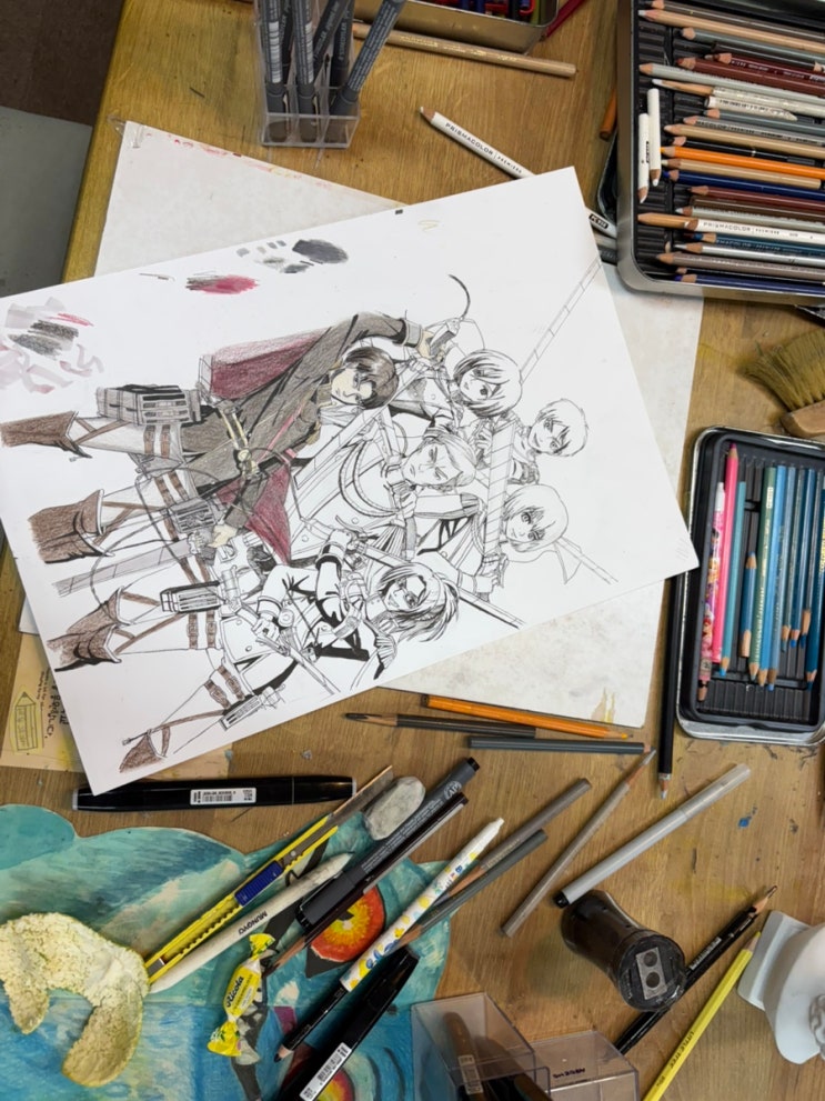 ㅗ 홍아크 중등친구들의 다양한 작업들을 소개합니다 중등연령의 특징중에 하나인 애니매이션^^입문 진격거부터 하나코까지 ㅎㅎ 라이너로 섬세히 따서 이번엔 컬러링을 좀더 추가한 학생의 팬아트 나무판에 스케치후 아크릴물감으로 채색한 만다라 디자인 기초디자인 개체표현을 주로 작업하는 중학생친구의 묘사 이것저것 원하는 이미지를 그리고 아크릴판에 긁고 목탄으로 그린 활동들 신체적인 변화와 학업이 주는 부담감으로 말로 표현하기 어려운 불안, 분노, 우울 같은 감정을 그림으로 자연스럽게 표현하기도 하고 아이들과 소통해보면 또래관계 갈등에서 오는 긴장이 높아 미술을 놀이삼아 집중함으로써 안정감을 느끼기도 합니다 ’홍....... <img src="https://blogthumb.pstatic.net/MjAyNTEwMThfMTQg/MDAxNzYwNzk0NzQwNDA3.8WsamfSCfY1Hrw3jSHYs7K8dIpTPOkXasPq0dl3Xlz8g.VCGMpN12bxNBfT-E13B3Tc3E1FpracG5BGcq08QM3pUg.JPEG/IMG%A3%DF1402.jpg?type=s3" />