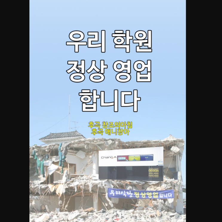 안녕하세요. 후곡 애니창아 입니다. 모처럼 인사드리게 되었는데요. 후하 후하 지금도 숨 쉬는 중입니다. 지난 기간 동안 애니고 입시에 압도적인 결과를 내면서 블로그를 잠시 소홀했던 안타까운 상황이 있었습니다. 하지만 이제 다시금 블로그 개장합니다. 더 많은 소식과 풍성한 볼거리로 여러분들께 다가가도록 하겠습니다. <img src="https://blogthumb.pstatic.net/MjAyNjAzMTNfNiAg/MDAxNzczMzc3MTYwMTI1.O18eQzfSp0ajHXqESijkdFIri_DJFbj3eH5aUOlPDN0g.WT7PM7DxGywJngznO4MD3DrDt_xuyBEJgu-fmnk14XYg.PNG/%C8%AD%B8%E9_%C4%B8%C3%B3_2026-03-13_134407.png?type=s3" />