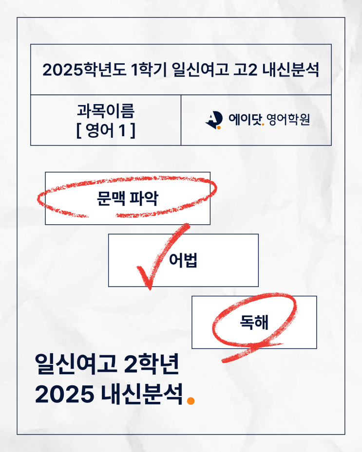 2025학년도 1학기 일신여고 고2 영어 중간고사 내신 분석 이 시험은 교과서 중심으로 출제되었지만, 모의고사와 외부지문이 함께 포함되며 지문 이해력과 독해 실력을 함께 확인하는 시험이었습니다. 특히 어법·순서 유형의 높은 비중을 통해 단순 암기보다 문장 구조와 글의 흐름을 정확히 파악하는 능력이 중요한 시험이었습니다. 특히 고1 때보다 모의고사와 외부지문의 비중이 증가하여 단순히 교과서 암기만으로는 고득점이 쉽지 않은 시험이었습니다. ➡️ 평소 독해 실력이 점수에 영향을 주는 구조였습니다. 지문을 정확히 숙지했다면 ➡️ 기본 점수(약 80점)는 확보할 수 있는 시험이었습니다. 하지만 그만큼 작은 실수 하나가 등....... <img src="https://blogthumb.pstatic.net/MjAyNjAzMDZfNzYg/MDAxNzcyNzk3ODg3MTg3.HkVBmQzHiTIJBBgHK9mWE_OVAyVSO68xJP1_4VPHUWgg.EpJZBebv5jp9v5Se9l6-goEzqzvz0fouNW0yX4FZ50gg.PNG/%BF%A1%C0%CC%B4%E5-%B3%BB%BD%C5%BA%D0%BC%AE-%C0%CF%BD%C5%BF%A9%B0%ED-%B0%ED2.png?type=s3" />