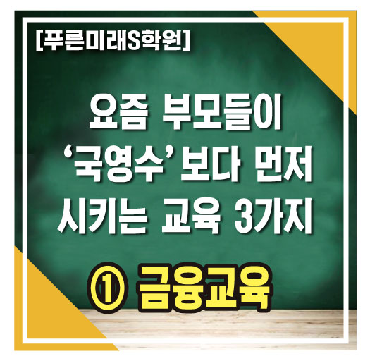 학생과 함께 성장하는 푸른미래S학원입니다. 예전엔 아이들에게 돈 이야기를 하는 것을 조심스러워하는 분위기도 있었습니다. 하지만 요즘은 상황이 많이 달라졌습니다. 아이들이 어릴 때부터 다음과 같은 소비 환경에 자연스럽게 노출되기 때문입니다. 문제는 많은 학생들이 돈을 사용하는 경험은 있지만, 돈을 관리하는 경험은 거의 없다는 것입니다. 그래서 최근에는 청소년 시기부터 금융교육이 필요하다는 이야기가 많이 나오고 있습니다. ▌ 금융교육이 부족하면 생기는 문제 금융교육을 받지 않은 아이들은 다음과 같은 모습을 보이기도 합니다. 특히 디지털 결제가 익숙한 환경에서는 돈이 실제로 줄어드는 느낌을 체감하기 어려운 경우....... <img src="https://blogthumb.pstatic.net/MjAyNjAzMTZfMjQz/MDAxNzczNjM3MjcwNTI4.h2Gzb3jDKyI-iK57YiKnqYgeuJwVmSvkUa1UqYpSl98g.shNt8018Eb5C4RJMwPJ5DSNLD8N-6g9tfzh6Xu_0OX4g.JPEG/%BF%E4%C1%F2%BA%CE%B8%F0%B5%E9%C0%CC%B1%B9%BF%B5%BC%F6%BA%B8%B4%D9%B8%D5%C0%FA%BD%C3%C5%B0%B4%C2%B1%B3%C0%B0-%C3%BB%BC%D2%B3%E2%B1%DD%C0%B6%B1%B3%C0%B0%BD%C5%C1%A43%B5%BF%BF%B5%BE%EE%BC%F6%C7%D0%BF%F8%C1%DF%B0%ED%B5%EE%B8%F1%B5%BF%BE%E7%C3%B5%B1%B8%B9%E9%BE%CF%B0%ED%B0%AD%BD%C5%C1%DF%C7%AA%B8%A5%B8%B6%C0%BB%C7%AA%B8%A5%B9%CC%B7%A1%BF%A1%BD%BA%C7%D0%BF%F8%BA%ED%B7%CE%B1%D7%BD%E6%B3%D7%C0%CF-%BA%B9%B1%B8%B5%CA.jpg?type=s3" />