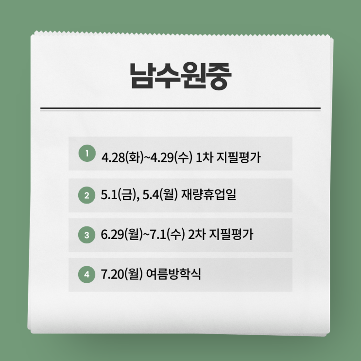 2026학년도 상반기 학사일정을 바탕으로 우리 아이 학교의 중간, 기말고사 일정을 미리 파악하여 여유있게 내신을 준비할 수 있도록 주요 일정을 공유합니다. <img src="https://blogthumb.pstatic.net/MjAyNjAzMTdfMjc4/MDAxNzczNjc0MDcwNjYx.TIEZjw7PmSGOFJsxOBJVA0XjdLXcCnZORDq_fejphqwg.MiztXbt5MRfwbfqoj25eiYRgI6oUxOWLODrE-HbJdBwg.PNG/4.png?type=s3" />