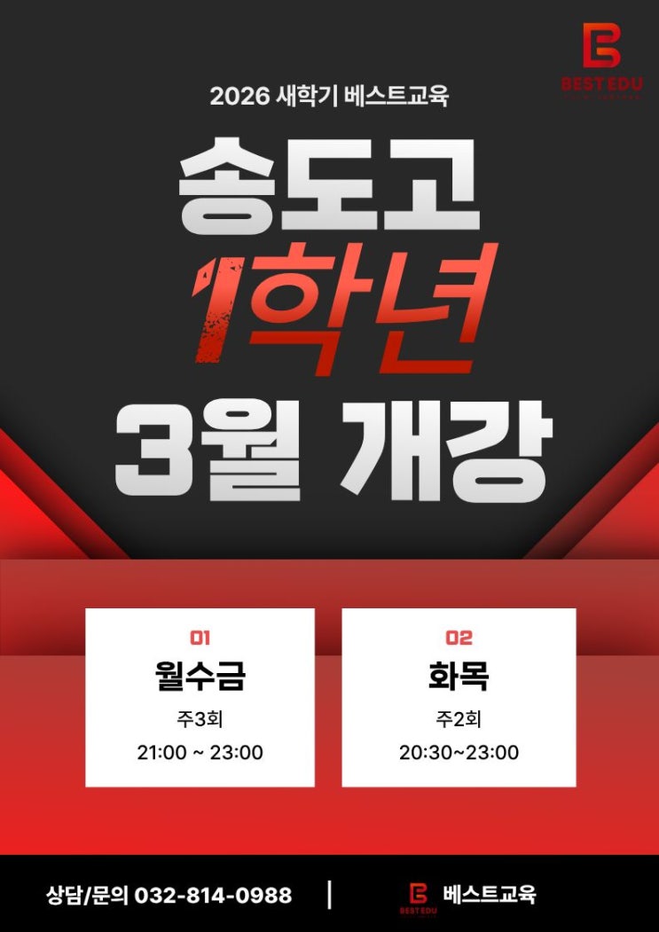 안녕하세요! 한 시간도, 한 푼도 아깝지 않게, 결과로 증명하는 베스트교육 인천연수직영캠퍼스입니다:) 베스트에듀가 2026년 새학기를 맞아, 송도고 1학년 학생들의 3월 개강이 시작되었습니다. 횟수에 따라 두 개의 반이 운영됩니다. 01. 월·수·금 시간: 21:00 ~ 23:00 (주 3회) 02. 화·목 시간: 20:30 ~ 23:00 (주 2회) 송도고 1학년 학생들의 소중한 첫 학기, 베스트에듀가 진심을 다해 응원합니다! 이 외에 자세한 문의 사항이 있으시면 전화 혹은 방문 상담해주시길 바랍니다 :) 꼼꼼하고 완벽한 내신 대비로 학생들이 최상의 결과를 얻을 수 있도록 늘 최선을 다해 노력하겠습니다. 믿고 맡겨주시는 만큼 기대에 부응하는 베스트교육이 되....... <img src="https://blogthumb.pstatic.net/MjAyNjAzMDVfMTI4/MDAxNzcyNzA5MzYyNTE3.OAqa316IIMTXd3ortmdbjdSJ851b5q4VCBxv8CQH4Vog.Xu9TjiqXGUxLbWN0alCjtL-H9Sdloz9VOnTLvBgWkPwg.JPEG/%BC%DB%B5%B5%B0%ED_%B0%B3%B0%AD_%C6%F7%BD%BA%C5%CD_%283%29.jpg?type=s3" />