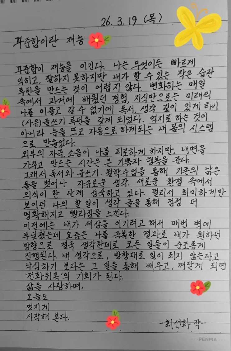 오늘은 ‘꾸준함’에 대해 다시 생각해 봅니다. 빠르게 잘하는 것보다 천천히라도 멈추지 않는 것이 얼마나 큰 힘이 되는지 요즘 더 깊이 느끼고 있습니다. 아이들을 지도하다 보면 처음에는 어려워하던 아이가 매일 조금씩 반복하며 어느 순간 스스로 해내는 모습을 봅니다. 그때 깨닫습니다. 재능보다 더 중요한 것은 꾸준함이라는 것을요. 공부는 특별한 능력이 아니라 작은 습관이 쌓여 만들어지는 힘입니다. 그래서 저희는 아이들이 부담 없이 매일 조금씩 해낼 수 있는 자신만의 학습 루틴을 만들어 가도록 돕고 있습니다. 조용히 쌓인 시간은 결코 사라지지 않고 아이의 실력과 자신감으로 반드시 돌아옵니다. 오늘도 교실에서 아이들의 꾸....... <img src="https://blogthumb.pstatic.net/MjAyNjAzMTlfMjAg/MDAxNzczODY4NDU3Mzcy.Nmh13IEwrhDpWCAbQTkRqoaHHYZEPVkvMwlABIrrry4g.CL59xbGKm2PqKoYytsA7VwdxlXvZid-HKPbUCKRHIKUg.JPEG/900%A3%DF20260319%A3%DF053509.jpg?type=s3" />