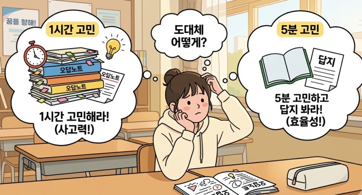 안녕하세요! 지투수학학원 입니다. 새 학년, 새 학기를 맞아 수학 공부 계획을 세우며 유튜브나 교육 칼럼을 찾아보신 학부모님, 학생 여러분! 아마 전문가마다 하는 말이 달라서 많이 혼란스러우셨을 겁니다. "수학은 사고력이다! 안 풀려도 1시간 동안 끈질기게 고민해라!" VS "아는 것도 없는데 무슨 고민이냐? 5분만 고민하고 빨리 답지를 봐라!" 도대체 누구의 말이 맞을까요? 결론부터 말씀드리면, 둘 다 맞을 수도 있고 둘 다 틀릴 수도 있습니다. 학생의 '현재 등급'과 '시기'에 따라 정답은 완전히 달라지기 때문입니다! 오늘은 우리 아이의 수학 성적을 1등급으로 끌어올릴 '등급별/시기....... <img src="https://blogthumb.pstatic.net/MjAyNjAzMTFfMTQg/MDAxNzczMjI3NDU4OTE1.MHpkm9lyPHTRAQ0gw3Coi1iL1ZbTrYmLv0ZcZ0nS29kg.Ru0ykjZdZi_WF4sgJHJCM5JNcga7yOfqoN9mBI6ziaMg.JPEG/KakaoTalk_20260311_201015076.jpg?type=s3" />