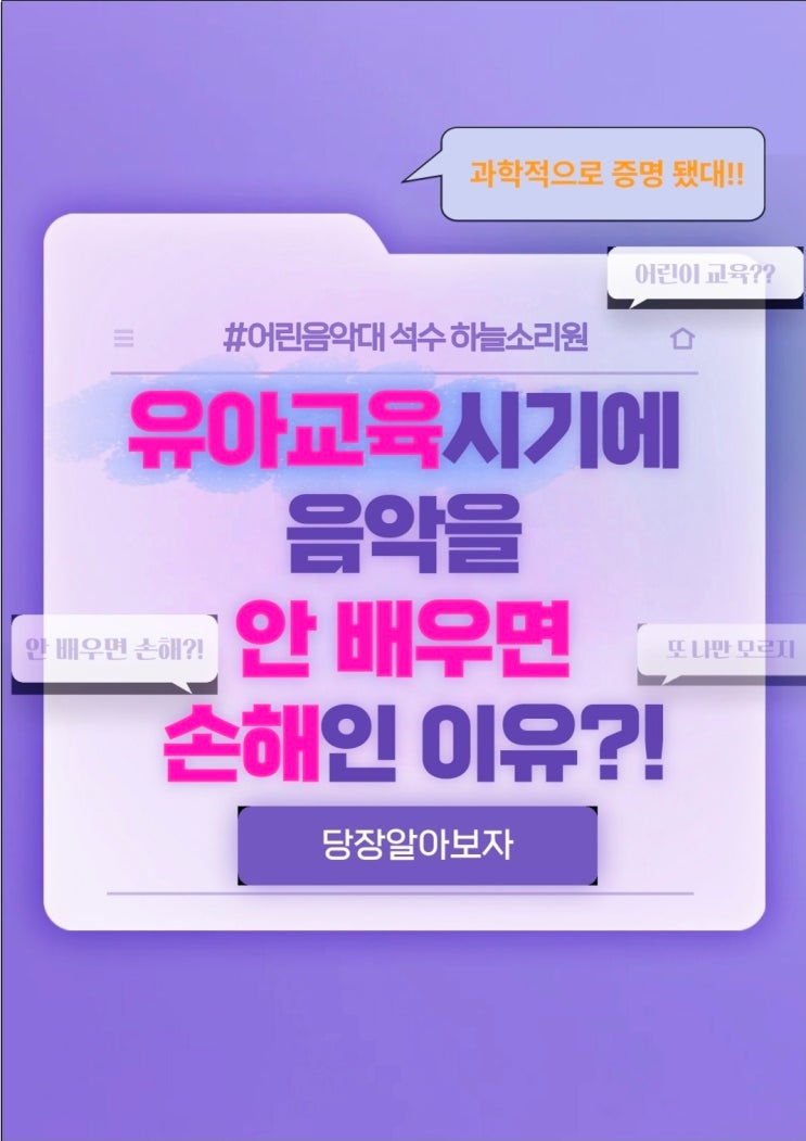 석수동(충훈부)음악학원에서는 한곳에 정착하여 다년간(18년간) 5세부터 실버까지 수업을 하고 있으며 오늘은 유아기때 음악을 접하게 되면 나타나는 아주 좋은 정보들을 드리려고 합니다. 유아기는 ‘뇌 발달의 황금기’로, 음악을 듣고 즐기는 활동자체만으로도 신체·인지·언어·정서 발달을 촉진하는 자극이 된다는 과학적으로 증명이 되었다는것도 알려드립니다. 우리 소중하고 귀한 아이들의 중요한 시기에 음악을 접하며 행복 자원이 많아질 수 있길 바랍니다. 아이에게 음악교육 이란? 세르반테스의 ‘음악이 있는 곳에 악이 있을 수 없다’는 말이나 플라톤의 ‘음악과 리듬은 영혼의 비밀 장소로 파고든다’는 명언을 인용하지 않더라도....... <img src="https://blogthumb.pstatic.net/MjAyNjAzMDhfMjQx/MDAxNzcyOTY1NjkzMzMz.i4HVZjSsSbEo3VDmwaLEoQi3X1V8U5bkVruPsTdznukg.FgxwK0rKsdbGJ5t3seF9blyzmEVNuRI5n4f_GW4BUkUg.JPEG/%C7%D0%BF%F8%C8%AB%BA%B81.jpg?type=s3" />