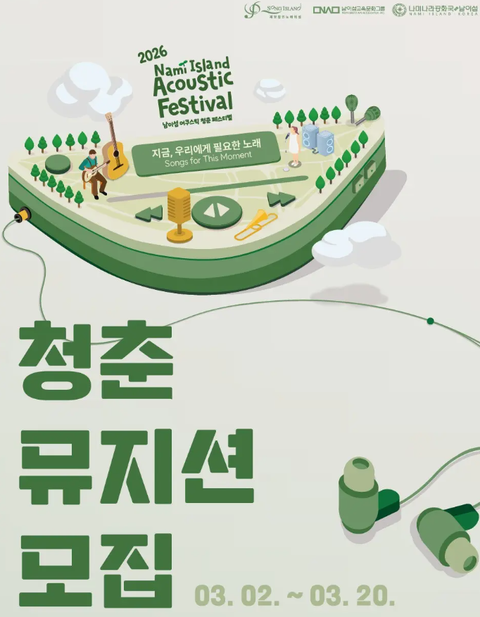 남이섬에서 열리는 청춘 페스티벌! 안녕하세요~ 일산 탄현 실용음악학원 사운드맵실용음악학원입니다~!! 겨울에서 봄으로 넘어가며 푸릇하고 따뜻한 날이 지속되면 야외 활동이 많이 생각나시죠~?? 그 중 음악 활동인 버스킹을 빼놓을 수가 없네요! 오늘은 버스킹 참여 관련 안내문을 가지고 왔습니다 10년의 울림, 더 깊어진 청춘의 선율 "2026 남이섬 어쿠스틱 청춘 페스티벌" 남이섬 어쿠스틱 청춘 페스티벌이 어느덧 열 번째 봄을 맞이합니다! 빠르게 흘러가는 세상 속에서 우리에게 정말 필요한 것은 마음을 가만히 두드리는 '진심 어린 노래' 아닐까요? 당신의 목소리로 남이섬 숲을 채워주세요 여러분의 무대를 기....... <img src="https://blogthumb.pstatic.net/MjAyNjAzMTBfMTk3/MDAxNzczMTI1MTI4Mzcy.XMH1TJTiAmsDvtNpsiUzZn_qMQFhqqP57SQa8jgux7Ig.4x_s-XM87iAGsf39HHjzXHVnZqGEgG-uciPcfLf996sg.PNG/image.png?type=s3" />