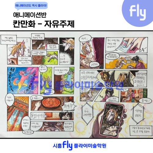 안녕하세요 ~ 시흥플라이미술학원입니다. 오늘 애니반은 칸만화로 찾아왔습니다. 학생들이 자유롭게 주제를 선택해서 그렸는데요! 바로 보러가실까요?ㅎㅎ 스토리를 기-승-전-결로 설명드리겠습니다! 기 인간이 되고 싶은 유니콘은 백일 동안 마라탕을 먹고 몸에 변화가 생깁니다. 승 손이 생긴걸 본 유니콘은 마라탕을 먹으러 갔지만 마라탕에 비친 자신을 보며 충격을 먹습니다. 전 그러던 유니콘에게 한 남자가 캐스팅을 합니다. 결 데뷔를 한 유니콘은 큰 인기를 끌며 성공합니다. 자유 주제로 진행한 개그병맛의 칸만화입니다. 개그만화 인 만큼 가볍고 병맛스러운 이야기로 구성을 했으며 그에 맞게 연출에도 개그컷들과 과정되게 연출을 하....... <img src="https://blogthumb.pstatic.net/MjAyNjAyMjRfNDcg/MDAxNzcxOTIxMTc2MzQ2.0yTTLZrSKUxXigORO6dFTGQDVxgPosekv9AQs6rA_zgg.FYK38x4i992WmKpbmcC3iSCvZSC-QXaYlkCBY6XiMp0g.PNG/001_%2842%29.png?type=s3" />