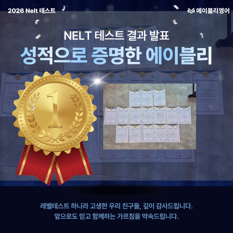 고촌 지역에서 '작지만 강한 학원'으로 자리매김하고 있는 에이블리영어입니다. 우리 아이들이 이번 **NELT(능률영어능력검정시험)**에서 거둔 놀라운 성과를 축하하며, 고촌초·고촌중·고촌고 학부모님들께 기쁜 소식을 전해드립니다. 고촌 영어의 자부심, 에이블리 영어가 증명했습니다! 이번에 실시한 NELT는 단순한 학원 자체 시험이 아닙니다. 국내 영어 교육의 명가 NE능률에서 개발한 IBT 방식의 전문 레벨테스트로, 전국 단위의 응시생들 사이에서 우리 아이의 객관적인 위치를 파악할 수 있는 공신력 있는 시험입니다. 어휘, 문법, 듣기, 독해 전 영역에 걸쳐 중고등 내신은 물론 수능 실력까지 미리 가늠해 볼 수 있는 이....... <img src="https://blogthumb.pstatic.net/MjAyNjAzMTRfNDAg/MDAxNzczNDY0MDQ0MDI4.7vAYV50HjAJ3Gp7MNnx-3xxsLodk1f3pawr37EasK20g.z9pNsn6AKbgfviVyIiihOgoflnvwTJ3ZISs9BJ_xcK8g.PNG/%B3%DA%C6%AE%C5%D7%BD%BA%C6%AE.png?type=s3" />