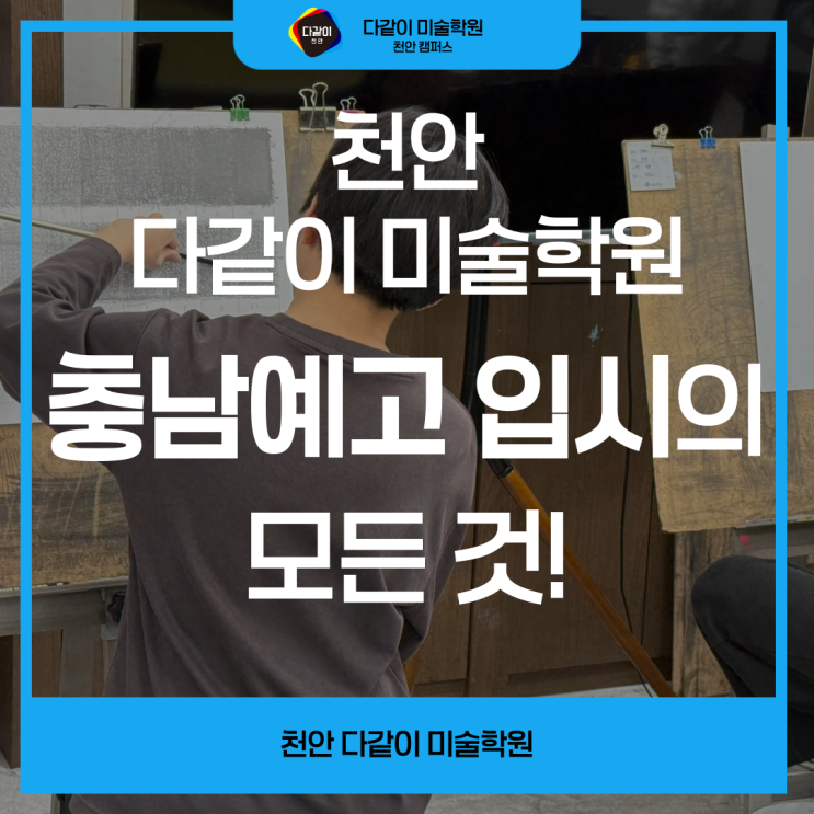 안녕하세요, 천안 불당동 다같이 미술학원입니다! 아이들의 꿈과 진로를 고민하는 학부모님들께서는 예술고등학교 입시가 늘 큰 관심사일 수밖에 없습니다. 특히 충남예술고등학교는 지역 내 대표적인 예술 인재 양성 학교로, 매년 많은 학생들이 지원하고 있습니다. 입시를 앞둔 아이들은 물론이고 부모님들 역시 “어떻게 준비해야 할까?...” 하는 걱정이 많으실 텐데요. 그래서 이번 글에서는 올해 충남예고 미술과 입시 정보를 정리해 드리고 우리 학원에서 어떻게 준비를 도와드리는지 안내드리려 합니다. 충남예술고등학교의 전형 일정은 보통 10월 중순부터 원서 접수가 시작되고, 실기 시험은 10월 말에 진행되는 경우가 많습니다. 예술....... <img src="https://blogthumb.pstatic.net/MjAyNjAzMTBfMTc3/MDAxNzczMTI1MTQ5NjM5.auHoWX3NSKRKscMb9UhA891uzQQ8dslIktp11yAgQ3Qg.Y6iOBVXRU8jEMx5K-Tr84RzI9a7sDjoQVWg8WAxjR2Ag.PNG/%C1%A6%B8%F1%C0%BB-%C0%D4%B7%C2%C7%D8%C1%D6%BC%BC%BF%E4__%BA%B9%BB%E7%BA%BB-_2_-007.png?type=s3" />