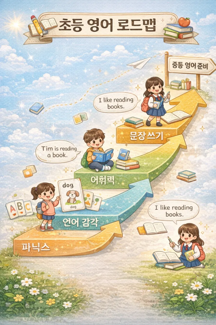 새 학기가 시작되면 많은 학부모님들께서 같은 질문을 하세요. “지금 우리 아이는 영어를 어떻게 해야 할까요?” 영어는 학년이 올라갈수록 단순 암기 과목에서 ⭐️사고력 과목으로⭐️ 바뀝니다. 그래서 신학기에는 방향 점검이 가장 중요합니다. 초등 시기의 영어는 언어 체력 만들기가 핵심입니다. ✔ 1단계: 읽기 기반 만들기 합성식 파닉스로 정확한 읽기 전환 소리 → 단어 → 문장으로 확장 ✔ 2단계: 어휘력 누적 독해 속도를 좌우하는 것은 어휘력 매일 점검 가능한 구조 필요 ✔ 3단계: 원서 정독 영어로 읽고 정확히 이해하고 한글을 보며 영작까지 이 시기에 쌓인 언어 감각이 중학교 내신과 수행평가의 기반이 됩니다. <img src="https://blogthumb.pstatic.net/MjAyNjAzMDVfOCAg/MDAxNzcyNzE5MzQ4NTQy.2DZPaZFMtK-oYG02niQPGbscxxOfUVOWkI_pvba0Vi0g.OYYTMt7wdH1NU89pMbJuS6XA0jUY7eUusv5yJqtxPQQg.PNG/900%A3%DFfile%A3%DF000000005f0871fd8f7c9ee2f2b9b9ef.png?type=s3" />