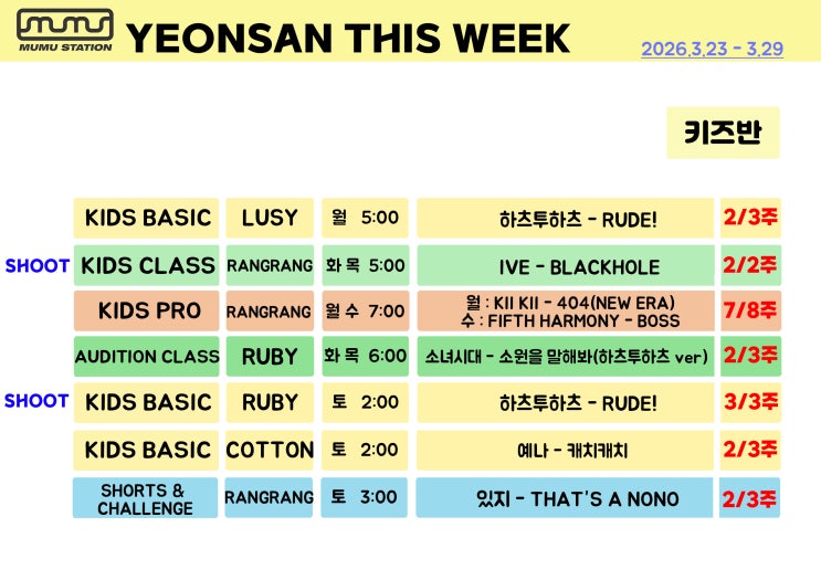 [뮤뮤댄스 연산] 금주의 시간표 2026년 3월 넷째주 곡명표 2026. 3.23 ~ 3.29
