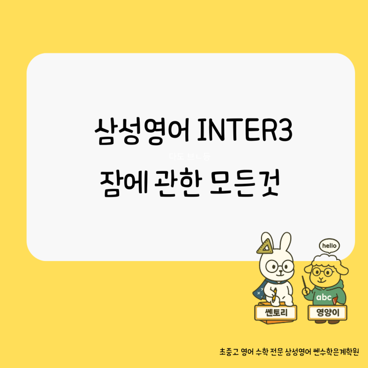 It's time to get ready for bed. Sleep is boring,I'm not tired -삼성영어 inter 3 reading book 중 - 안녕하세요. 삼성영어 쎈수학 은계학원 달님쌤입니다. 영어 공부를 하다 보면 많은 아이들이 문법을 어렵게 느끼는 이유가 있습니다. 바로 문법을 “규칙”으로 먼저 배우기 때문입니다. 하지만 삼성영어에서는 문법을 이야기(Story) 속에서 자연스럽게 만나도록 커리큘럼이 구성되어 있습니다. 오늘은 삼성영어 IN 3 교재에 나오는 “All About Sleep” 이야기를 소개해 보려고 합니다. 1. 잠자기 싫은 아이 이야기 이 이야기에는 잠자기 싫어하는 아이가 등장합니다. 엄마는 말합니다. "It's time to sleep." 하....... <img src="https://blogthumb.pstatic.net/MjAyNjAzMDlfMTA4/MDAxNzcyOTgyMzI1NTM0.oGUmcSQX9c3J2TCXSOt0UmFX49pTWupx-WgZTN8HwsAg.T7fQYOeMBN5Hx6XfxBkAOZMvniMzBkyBSrZvKj_eWUYg.PNG/Yellow_coming_soon_Instagram_post_%286%29.png?type=s3" />