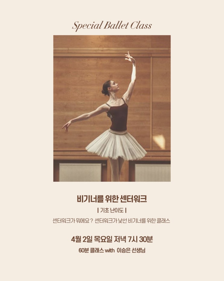 정규 수업이 쉬어가는 날, 하루만 열리는 특별한 클래스 4월 특강 비기너를 위한 센터워크 가볍게 참여해보셔도 좋고, 평소 궁금했던 수업을 경험해보시기에 좋은 기회가 될거에요 이런 분들께 추천드려요 ✔ 센터워크가 뭐에요? 처음 들어보신 분 ! ✔ 바 없이 하는 동작이 아직 낯선 분 ! ✔ 취미발레 새내기 중 한 단계 더 나아가고 싶은 분! 수업 내용 센터워크는 바(barre)를 잡지 않고 바에서 배운 기본 동작들을 센터(연습실 가운데서)에서 진행하는 동작들입니다. - 폴드브라 (팔 동작) - 바 에서 배운 기본 동작들 바 없이 해보기 - 간단한 스텝 - 초보자를 위한 턴 - 제자리 점프 를 통해 클래식 발레의 움직임을 조금 더 배워보....... <img src="https://blogthumb.pstatic.net/MjAyNjAzMTdfMjAx/MDAxNzczNzI0OTUzODYw.bo4anl3Fh6CfbWlKF2t16gFuBHzba_qteCcrCQMieQ0g.ptVzzfNnPBCwn0qprwHRkqVfMiSSZZEUEpx2UPXARtgg.JPEG/4%BF%F9%C6%AF%B0%AD%BC%AD%C3%CA1.jpg?type=s3" />