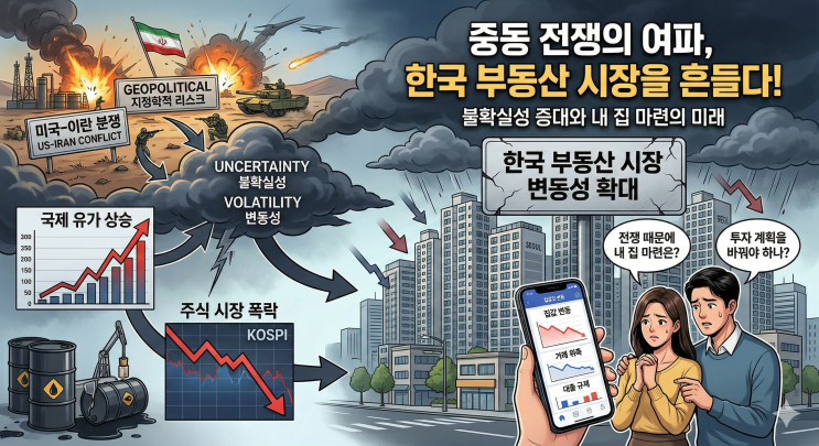 지난주 갑자기 미국이 이란 핵시설을 공격하며 전쟁이 시작되었습니다. 트럼프 대통령은 금방 끝날 것처럼 이야기하지만 점점 복잡한 상황으로 이어지며 장기화될 가능성이 높아지고 있습니다. 한국 주식시장은 폭락하고 있는 중에 부동산 시장의 변동성도 커질 수 있다는 우려가 나오고 있습니다. 최근 다주택자에 대한 압박으로 변동성이 커진 요즘, 내 집 마련이나 투자 계획에 어떤 영향을 미칠지 궁금해하는 분들이 많으실 겁니다. 저도 그렇습니다. 중동 지역의 지정학적 리스크는 단순히 먼 나라 이야기가 아니라, 국제 유가부터 환율, 물가, 심지어 우리 집값까지 흔들 수 있는 중요한 변수가 될 수 있습니다. 오늘은 미국 이란 전쟁이 한....... <img src="https://blogthumb.pstatic.net/MjAyNjAzMDRfMTMz/MDAxNzcyNjAyODc1ODMx.r_nWWrOxDrzDi9gzTlffJTqGzeEDN5fR1hDUy27qr4Qg.0EUgLbY8kv0uEYhE5xLvG7GSSd2ilXlnLUs1z7UdFk0g.PNG/Gemini_Generated_Image_euyntveuyntveuyn.png?type=s3" />