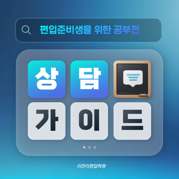 처음 편입을 알아보고, 시작 전 이라면?! 레벨테스트와 충분한 상담 후 전략적으로 준비 GO! 편입생을위한 상담가이드 안녕하세요~이찬이편입입니다 3월의 문이 드디어 열렸습니다. 여러므로 새로운 계획들이 시작되는 시기이기도 하기 때문에 내년의 편입시험을 위해서 많은분들이 편입공부법, 학원, 기관 등등 많이 알아보시는거 같은데요~ 이런 시기에는 특히 공부를 시작하기전이기 때문에!! 여기저기 많은 정보를 탐색해보고 효율적인 공부방법을 미리 알아보는것도 중요하니 꼭 잊지 마시길 바랍니다 편입시험을 준비하기전 학원에 상담하러 간다면..? 편입공부 계획을 짜기전 여기저기 알아보면서 상담을 많이들 받으시는데요. 그럴때 편....... <img src="https://blogthumb.pstatic.net/MjAyNjAzMDVfMjI3/MDAxNzcyNjY3MDI0MTEw.6yFWzr-lrC3xzKdqDDrTz0wgCothQPlUlwdb2pckBwAg.ocxzGu21ShNO8lP2IwqlVGRy1ed42wSkOiV5MkxUzmwg.PNG/%C1%A6%B8%F1%C0%BB_%C0%D4%B7%C2%C7%D8%C1%D6%BC%BC%BF%E4._%285%29.png?type=s3" />