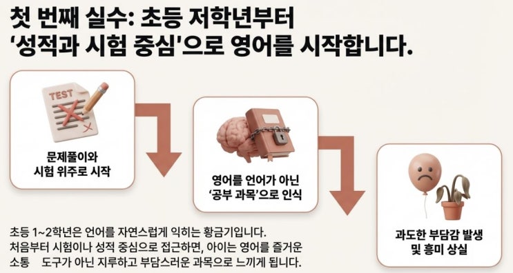 초등 영어 상담을 하다 보면 학부모님들이 가장 많이 하시는 말이 있습니다. “우리 아이도 영어를 잘했으면 좋겠어요.” 대부분의 부모님들은 아이의 영어 실력을 위해 많은 노력을 하십니다. 좋은 학원을 알아보고, 영어 책도 사주고, 영어 영상도 보여주려고 노력합니다. 그런데 아이의 영어 실력이 기대만큼 성장하지 않는 경우도 있습니다. 학원에서 학생들을 지도하다 보면 영어를 잘하는 아이들에게는 공통점이 있는 것처럼, 영어 학습이 어려워지는 경우에도 몇 가지 공통적인 패턴이 보입니다. 초등 영어에서 부모님들이 의도치 않게 하게 되는 대표적인 실수 세 가지를 말씀드려 보겠습니다. 1. 너무 빨리 ‘성적 중심 영어’로 시작하....... <img src="https://blogthumb.pstatic.net/MjAyNjAzMDlfMTEw/MDAxNzcyOTg0MDAwMjc1.xdcK4MtLasjyDKtfMuog-mxxZL8c-aItBXnE77fyWwsg.TE5vghp3jlXZ-ADtumwoyrLsSY7_QZ7yyOkeqPah9P0g.JPEG/2.JPG?type=s3" />
