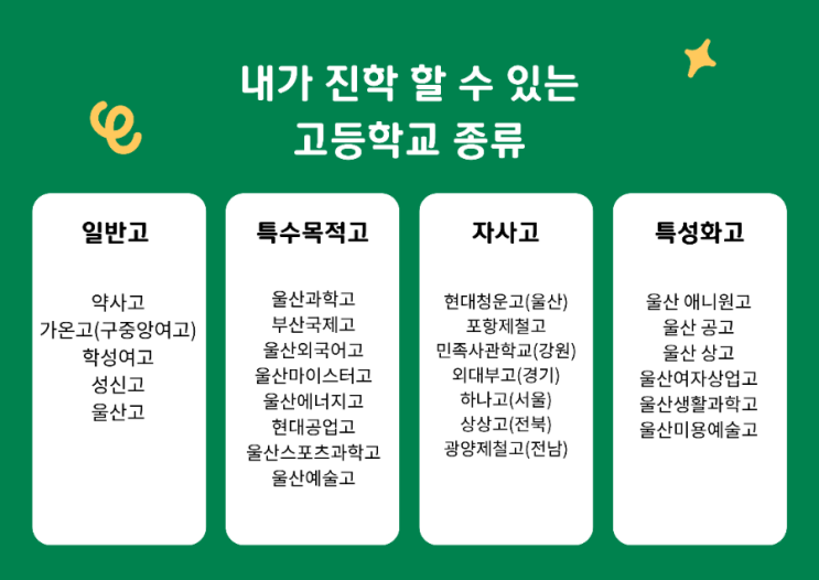 안녕하세요 울산 남외동에 위치한 남외GnB어학원입니다. 중학생 자녀를 둔 학부모님들께서 요즘 가장 많이 하시는 질문이 있습니다. “우리 아이, 어떤 고등학교를 선택해야 할까요?” “자사고? 특목고? 일반고? 뭐가 다른 건가요?” 이번에 남외GnB어학원에서 고등학교 종류 정리부터 지역별 입시 전략까지 한 번에 정리해드리는 입시 전문가 초청 세미나를 준비했습니다. ✔ 내가 진학할 수 있는 고등학교 종류 정리 고등학교는 크게 네 가지로 나뉩니다. 1.일반고 대학 진학이 목표인 가장 일반적인 형태의 고등학교 입니다. 자율학교, 공립·사립 일반고 등이 해당됩니다. 울산 지역에서는 많은 고등학교가 있지만 울산중구 남외동지역....... <img src="https://blogthumb.pstatic.net/MjAyNjAzMDNfMjY2/MDAxNzcyNTMxODY4NDg0.w8OF8HIaL9Um2RJYZm3rkj0xi7UKc-tvyoQvQb1vaAAg.Z6h1RgASJSkyWUHFG7qNDoqVUpiE6MwRcfWQKdFe_xMg.PNG/900%A3%DF1772506830801.png?type=s3" />
