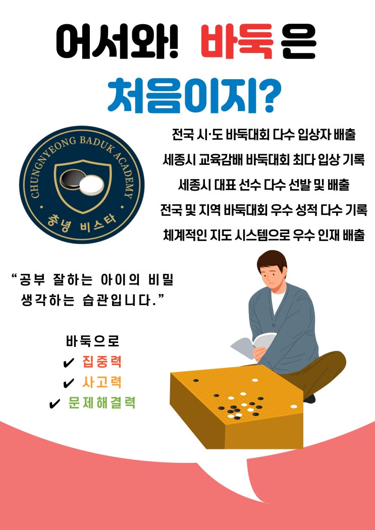 3월 새학기 모집|집중력과 사고력을 함께 키우는 바둑 수업 안녕하세요. 충녕비스타 바둑학원 고운점 박원장입니다. 세종시에서 초등 바둑학원을 찾고 계신 학부모님들께 3월 새학기를 맞아 안내드립니다 요즘 이런 고민 많으시죠? ✔ 우리 아이, 집중력이 너무 짧은 것 같아요 ✔ 문제는 푸는데 깊이 생각하는 힘이 부족해 보여요 ✔ 스마트폰 대신 도움이 되는 활동을 시켜주고 싶어요 ✔ 공부 습관의 기본기를 잡아주고 싶어요 초등 시기에는 성적보다 먼저 **‘생각하는 힘’과 ‘앉아있는 힘’**이 만들어져야 합니다. 바둑은 단순한 취미가 아니라 아이의 집중력 · 사고력 · 자기조절 능력을 함께 키워주는 두뇌 스포츠입....... <img src="https://blogthumb.pstatic.net/MjAyNjAzMDVfMzUg/MDAxNzcyNzAzMTkwODA3.f_SiTolNpCf9Al03y7WhjmONGIPgKwWNaC2Wp26rnmIg.AWMpc0TwdOpeZpFIGvdneTzYLiP1Af6O44pIKDPqebMg.JPEG/KakaoTalk_20260305_165826778.jpg?type=s3" />