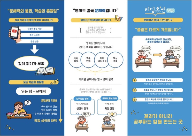 요즘 우리 아이들, 스마트폰과 숏폼 영상에 너무 익숙해져 있죠? 짧은 영상에만 노출되다 보니 정작 긴 글을 읽고 이해하는 '깊이 읽기'가 부족해지는 현상이 심각해지고 있습니다. 결국 모든 학습의 출발점은 문해력입니다. 문해력이 무너지면 국어, 영어뿐만 아니라 수학 문제 이해조차 어려워진다는 사실, 알고 계셨나요? 영어도 결국 '문해력'입니다 단어를 많이 외운다고 영어가 늘까요? 아닙니다! ♂️ 단어는 많이 알아도 글의 흐름을 읽지 못하면 점수는 결코 오르지 않습니다. 리딩오션 플립은 단순히 암기하고 해석하는 '단어 중심 영어'의 한계를 넘어, 진짜 실력을 키우는 '문....... <img src="https://blogthumb.pstatic.net/MjAyNjAzMDVfMTc1/MDAxNzcyNzEwNTU3OTE1.AR3A6hVI4pRxeuhcZ4ARLsQ_vU5q8-Qqj9Ya71Ieo_8g.Sltm-emg_ZdD_RDcjmK2XoJyB2lWnXfcQhhIq2SPoFcg.JPEG/%BF%EC%C1%F8_%C7%D0%BF%F8_%B8%AE%C7%C3%B7%BF_2.jpeg?type=s3" />