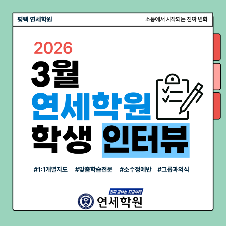 안녕하세요, 평택 연세학원입니다. 저희 연세학원은 지속적인 발전과 성장을 위해 학생들의 목소리에 귀 기울이며, 보다 다양한 소통의 장을 마련하고자 노력하고 있습니다. 그 일환으로 학생들이 단순히 수업을 듣는 것을 넘어, 학원에서의 배움과 성장이 어떤 의미로 다가오는지 직접 들을 수 있는 특별한 인터뷰 시간을 준비하게 되었습니다. 단순한 학습 결과뿐만 아니라 학원에서 느낀 경험과 생각을 학생 스스로 이야기할 수 있도록 인터뷰 시간을 갖는 것은, 연세학원이 추구하는 교육 철학과도 맞닿아 있습니다. 학생 개개인의 목소리를 존중하고, 그 안에서 배움의 가치를 재발견하며, 나아가 선생님들과 학부모님들께도 보다 생생한 학....... <img src="https://blogthumb.pstatic.net/MjAyNjAzMTNfNDUg/MDAxNzczMzk0MjgxMjI5.Wx3sNpn8Xf0Rfa79eaXjzVmayik6XdkjRa1yRwoUC2kg.Pjs_uxPAQ_IoBi3BoxhgmJqboMixsMo2Yg5SduaGVTIg.PNG/%C7%D0%BB%FD-%C0%CE%C5%CD%BA%E4-001_%287%29.png?type=s3" />
