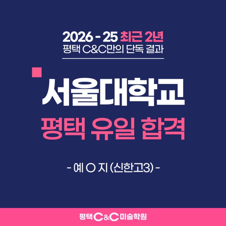 최근 2년간 평택 C&C가 보여준 눈부신 입시결과! - 2026년 서울·수도권 42명 합격! 2025년 서울·수도권 43명 합격! 지방대학 및 전문대를 제외한 순수 서울, 수도권 4년제 대학에 합격한 결과입니다! 2018년 이후 평택 지역내에서 서울대 미대 최종합격생을 배출한 학원은 C&C가 유일합니다. 합격년도를 표기하지 않은채 입시전형이 지금과는 많이 달랐던 오래전 서울대 합격생을 반복적으로 홍보하는 사례가 확인되니 주의하시기 바랍니다! 서울/세종 캠퍼스명을 표기하지 않고 홍보하는 사례가 많습니다. 서울캠퍼스 표기가 없다면 대부분 세종캠퍼스이니, 수험생과 학부모님들의 주의 깊은 확인이 필요합니다. 더불어 건국대 역시 서....... <img src="https://blogthumb.pstatic.net/MjAyNjAzMDFfMTk0/MDAxNzcyMzQxMTk2NTgx.SwMKHi3RNRw9yEYc--sV7Yo4sMSv0OOHSr4Wcm4kvrEg.wL5DwZPrnsmphRCN1oLre95sA7QDssxguBfcLrXBSugg.JPEG/002.jpg?type=s3" />