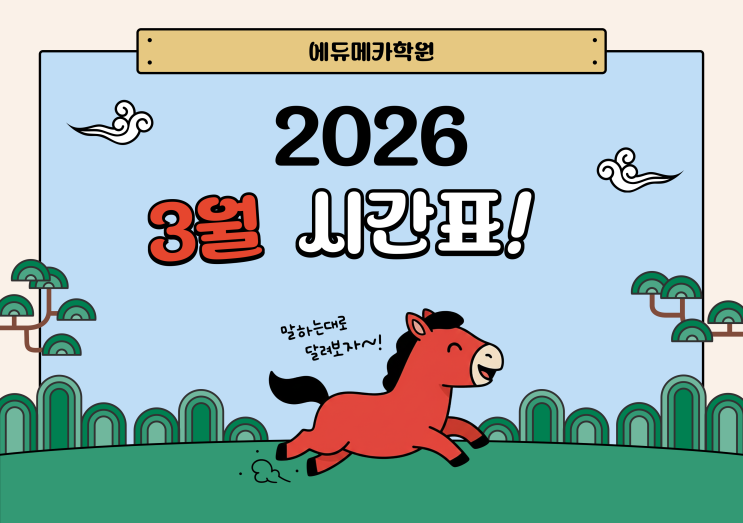 [2026년 에듀메카 3월 중고등부 시간표] 개강일: 2026년 03월 03일 (화) <중1 시간표> 월 금: 04:00~07:00 (문해정음+영어) 화 목: 04:30~07:30 (수학) <중2 시간표> 월 금: 04:00~07:00 (문해정음+영어) 화 목: 04:30~07:30 (수학) 수요일: 04:00~05:30 영어선행 수요일: 05:30~07:00 수학선행 <중3 시간표> 월 금: 04:00~07:00 (수학) 화 목: 04:30~07:30 (문해정음+영어) 수요일: 04:00~05:30 영어선행 수요일: 04:00~05:30 수학선행B 수요일: 05:30~07:00 수학선행A <고1 시간표> 월 금: 07:00~10:00 (수학) 화 목: 07:00~10:00 (영어) 토요일: 10:30~01:30 수학선행 <고2 시간표> 월 금: 07:00~10:00 (영어) ....... <img src="https://blogthumb.pstatic.net/MjAyNjAzMDNfMjgz/MDAxNzcyNTI3NDYwMDQw.H-iqVBon7Y6Tz1xYlNBlCYY3I48FZVKShiNRMq5cAPkg.b0nlpTh2DZbHk6QjVLWMnKp8XH_Dbw0eA0ygfEZshvkg.PNG/%C1%A6%B8%F1%C0%BB-%C0%D4%B7%C2%C7%D8%C1%D6%BC%BC%BF%E4_-001_%2812%29.png?type=s3" />