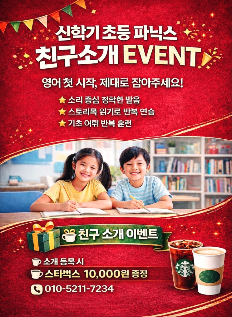 향동초 · 숲내초 친구들 주목 친구 소개 & 형제자매 등록 EVENT ! 안녕하세요 윤선생 아카데미 향동점입니다. 새 학기를 맞아 특별한 이벤트를 준비했어요! ✔ 내 친구를 소개하고 등록하면 ! ✔ 형제·자매가 등록하면 ! 스타벅스 10,000원 기프티콘 증정! 함께 공부하고, 선물도 받아 가세요! ✨ 1:1 맞춤 자기주도 학습 "학습 성향, 이해 속도, 어휘 수준, 읽기 능력" 을 정확히 진단한 후 개별 맞춤 학습으로 수업을 진행합니다. 기초가 단단해야 ✔ 어휘 학습이 쌓이고 ✔ 문장 읽기가 자연스러워지며 ✔ 말하기와 쓰기까지 확장됩니다. 기초 없이 문제만 푸는 영어는 오래가지 않습니다. "스스로 읽고, 스....... <img src="https://blogthumb.pstatic.net/MjAyNjAzMDNfMTMw/MDAxNzcyNTIwNDMzMzcx.bWEn3p-xbNiEVyOWOoUz3Y7EiPM0A66ydE4NQA8Y84Mg.A3-Cvofx_s-i9CJafJFVbI8EblT1jDXDpK3aGoIP-DEg.JPEG/KakaoTalk_20260303_151855881_01.jpg?type=s3" />
