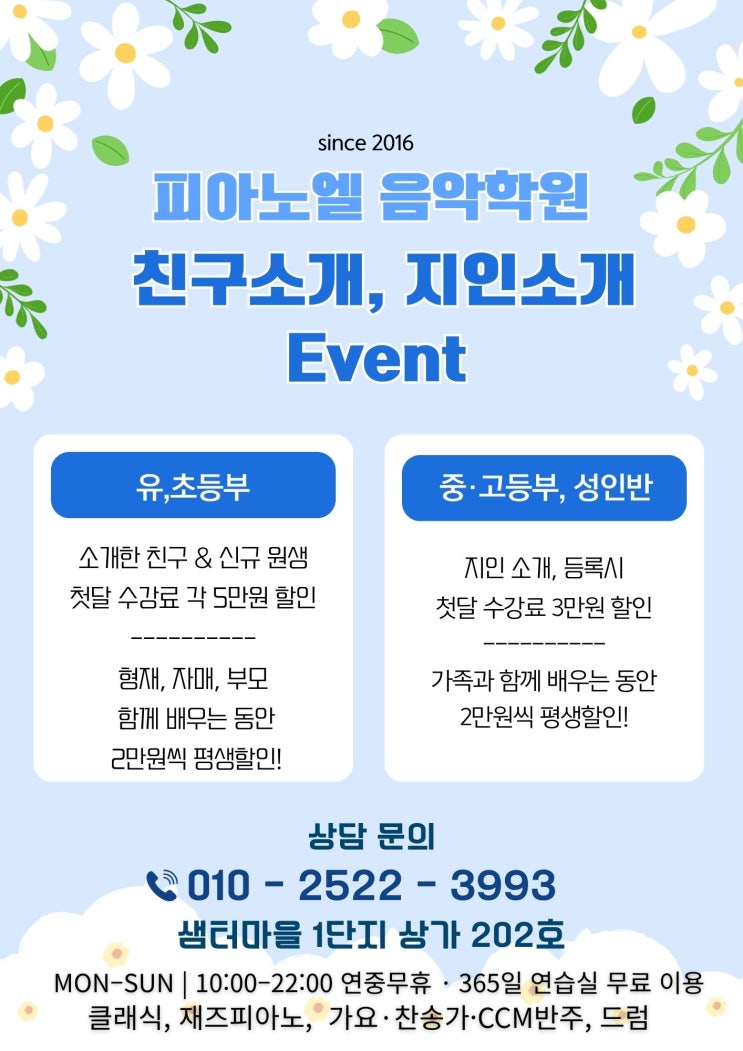 창릉 성인피아노 찾고 계세요?! 가까운 피아노엘에서 친구소개,지인소개 이벤트와 상담당일 수업시 할인 혜택까지! 가족과 함께다니면 혜택이 두배~